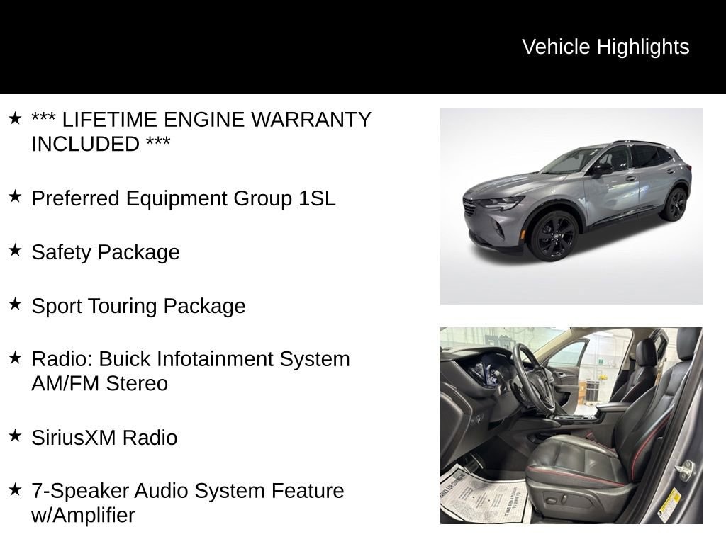 *** LIFETIME ENGINE WARRANTY INCLUDED ***, 7-Speaker Audio System Feature w/Amplifier, Apple CarPlay/Android Auto, Black Roof Rails, Body-Color Door Handles, Carpeted Front & Rear Floor Mats, Front Bin Center Console USB Ports, Heated Driver & Front Passenger Seats, Heated Steering Wheel, Lane Change Alert w/Side Blind Zone Alert, Lower Trim/Wheel Arch Moldings, Preferred Equipment Group 1SL, Premium audio system: Buick Infotainment System, Radio: Buick Infotainment System AM/FM Stereo, Rear Cargo Compartment Cover, Rear Cross Traffic Alert, Safety Package, SiriusXM Radio, Sport Alloy Pedals, Sport Touring Package, USB Charging-Only Ports, Wheels: 20 Aluminum w/Dark Finish, Wireless Apple CarPlay/Wireless Android Auto.