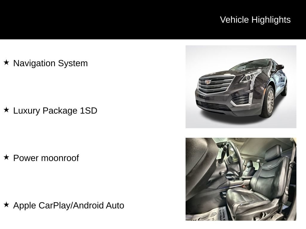 Apple CarPlay/Android Auto, Luxury Package 1SD, Navigation System, Power moonroof, 155 Amp Alternator, 2-Way Power Driver Lumbar Control Seat Adjuster, 2-Way Power Passenger Lumbar Control Seat Adjuster, 3.20 Axle Ratio, 8-Way Power Front Passenger Seat Adjuster, All-Weather Floor Mats, Auto-dimming door mirrors, Auto-dimming Rear-View mirror, Automatic Dual-Zone Climate Control, Bose Premium 8-Speaker Audio System Feature, Brake assist, Driver & Front Passenger Heated Seats, Driver vanity mirror, Dual front impact airbags, Dual front side impact airbags, Electronic Stability Control, Emergency communication system: OnStar and Cadillac connected services capable, Exterior Parking Camera Rear, Four wheel independent suspension, Front anti-roll bar, Front dual zone A/C, Front License Plate Bracket, Garage door transmitter, Halogen Headlamps, Heated door mirrors, Heated steering wheel, Illuminated entry, Knee airbag, Leather Seating Surfaces w/Mini Perforated Inserts, Leather steering wheel, Low tire pressure warning, Memory seat, Occupant sensing airbag, Outside temperature display, Overhead airbag, Panic alarm, Power door mirrors, Power Liftgate, Power passenger seat, Radio: Cadillac User Experience, Radio: Cadillac User Experience w/Embedded Nav, Rain sensing wipers, Rear anti-roll bar, Rear window defroster, Rear window wiper, Remote keyless entry, SiriusXM Satellite Radio, Speed control, Speed-sensing steering, Steering wheel memory, Telescoping steering wheel, Tilt steering wheel, Traction control, Trip computer, Variably intermittent wipers, Wheels: 18 x 8 Bright Machined Faced Aluminum, Apple CarPlay/Android Auto, Luxury Package 1SD, Navigation System, Power moonroof.