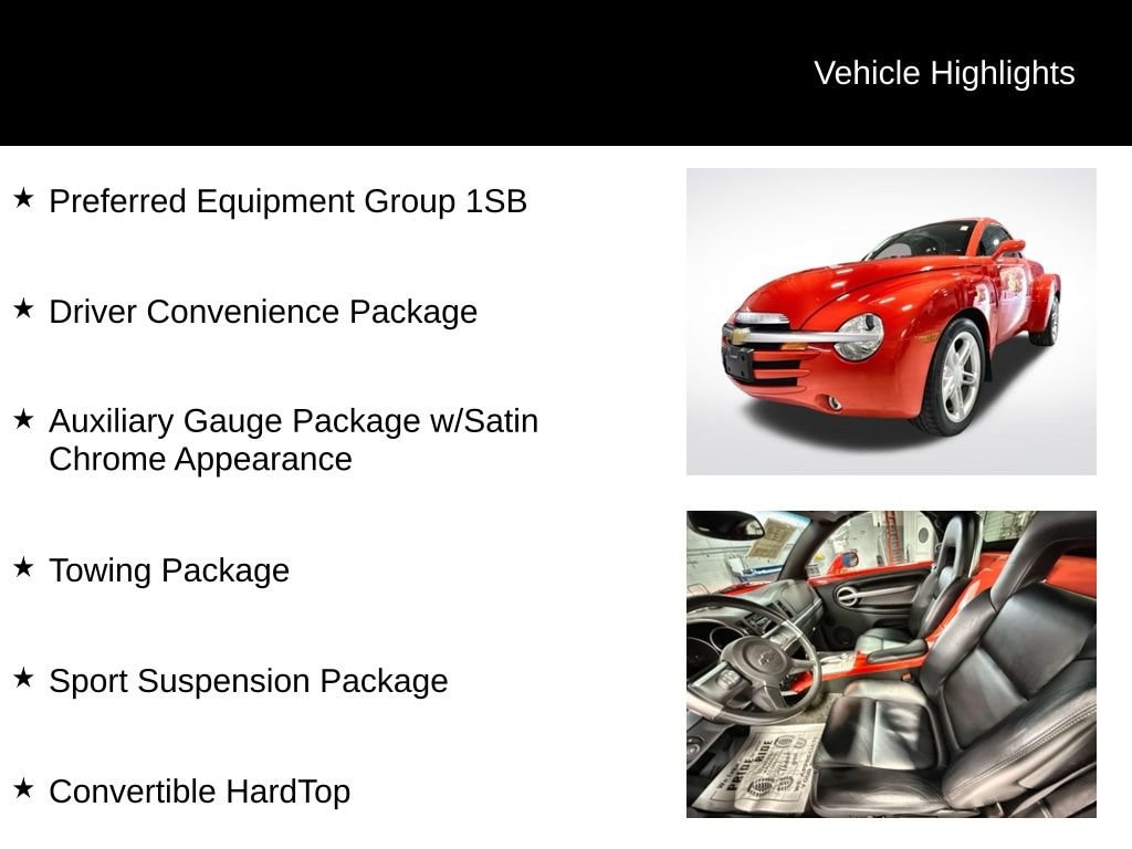 Auxiliary Gauge Package w/Satin Chrome Appearance, Convertible HardTop, Driver Convenience Package, Preferred Equipment Group 1SB, Sport Suspension Package, Towing Package, 3.73 Rear Axle Ratio, 4 Speakers, 4-Wheel Disc Brakes, ABS brakes, Air Conditioning, Alloy wheels, AM/FM radio, Auto-Dimming Inside Rear-View Mirror, Bumpers: body-color, Cargo Area Hard Liner, Cargo Compartment Trim, CD player, Convertible roof lining, Delay-off headlights, Driver door bin, Driver vanity mirror, Driver's Memory Seat, Dual front impact airbags, Dual front side impact airbags, Front 19 x 8 & Rear 20 x 10 Painted Aluminum Wheels, Front anti-roll bar, Front Bucket Seats, Front Center Armrest, Front fog lights, Front High-Back Reclining Bucket Seats, Front License Plate Bracket, Front reading lights, Front wheel independent suspension, Fully automatic headlights, Glass rear window, Heated door mirrors, Heated Driver & Front Passenger Seats, HomeLink Wireless Control System, Illuminated entry, Integrated roll-over protection, Panic alarm, Passenger cancellable airbag, Passenger door bin, Passenger vanity mirror, Power convertible roof, Power door mirrors, Power driver seat, Power Heated Color-Keyed Outside Rear-View Mirrors, Power passenger seat, Power steering, Power windows, Radio data system, Rear anti-roll bar, Rear window defroster, Remote keyless entry, Satin Chrome Appearance Engine Cover Insert, Speed control, Steering wheel mounted audio controls, Tachometer, Tilt steering wheel, Traction control, Trip computer, Ultrasoft Nuance Leather Seating Surfaces, Variably intermittent wipers, Auxiliary Gauge Package w/Satin Chrome Appearance, Convertible HardTop, Driver Convenience Package, Preferred Equipment Group 1SB, Sport Suspension Package, Towing Package.