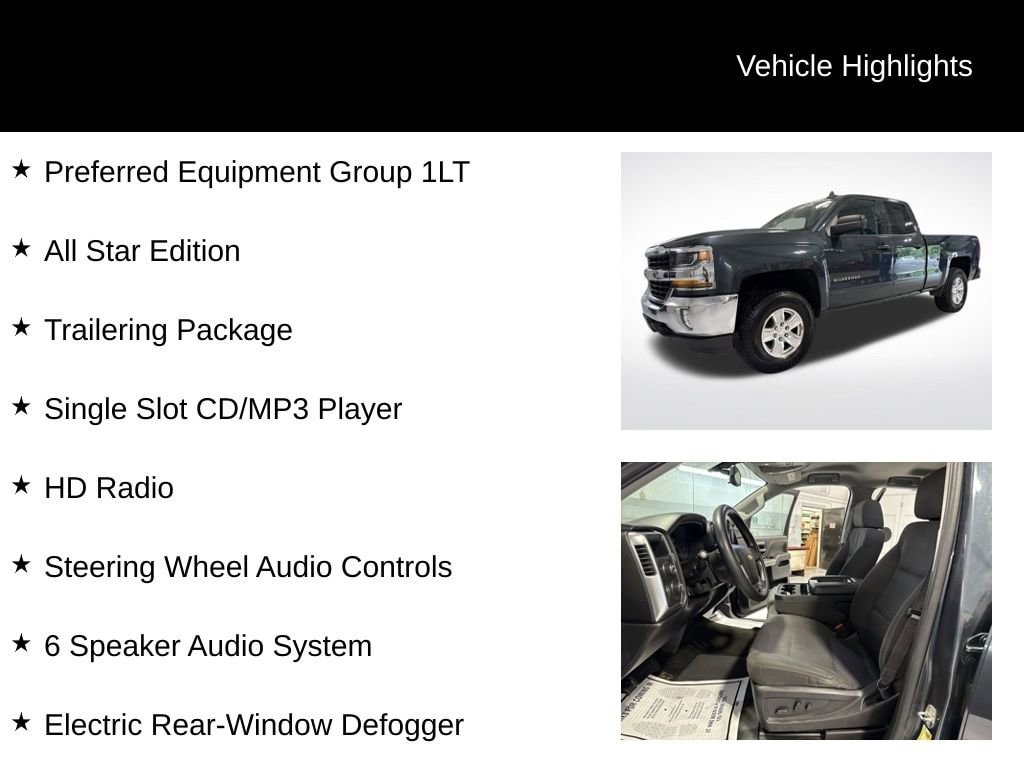 6-Speed Automatic Electronic with Overdrive, 4WD, Black Cloth, 110-Volt AC Power Outlet, 150 Amp Alternator, 4.2 Diagonal Color Display Driver Info Center, 6 Speaker Audio System, All Star Edition, Bluetooth® For Phone, Body Color Bodyside Moldings, Body-Color Door Handles, Body-Color Mirror Caps, Body-Color Power Adjustable Heated Outside Mirrors, Chrome Grille Surround, Color-Keyed Carpeting w/Rubberized Vinyl Floor Mats, Deep-Tinted Glass, Driver & Front Passenger Illuminated Vanity Mirrors, Dual-Zone Automatic Climate Control, Electric Rear-Window Defogger, EZ Lift & Lower Tailgate, Front Chrome Bumper, HD Radio, Leather Wrapped Steering Wheel w/Cruise Controls, Manual Tilt Wheel Steering Column, OnStar 3 Months Guidance Plan, OnStar w/4G LTE, Power Windows w/Driver Express Up, Preferred Equipment Group 1LT, Rear 60/40 Folding Bench Seat (Folds Up), Rear Chrome Bumper, Rear Vision Camera, Rear Wheelhouse Liners, Remote Keyless Entry, Remote Locking Tailgate, Remote Vehicle Starter System, Single Slot CD/MP3 Player, Steering Wheel Audio Controls, Thin Profile LED Fog Lamps, Trailering Package.