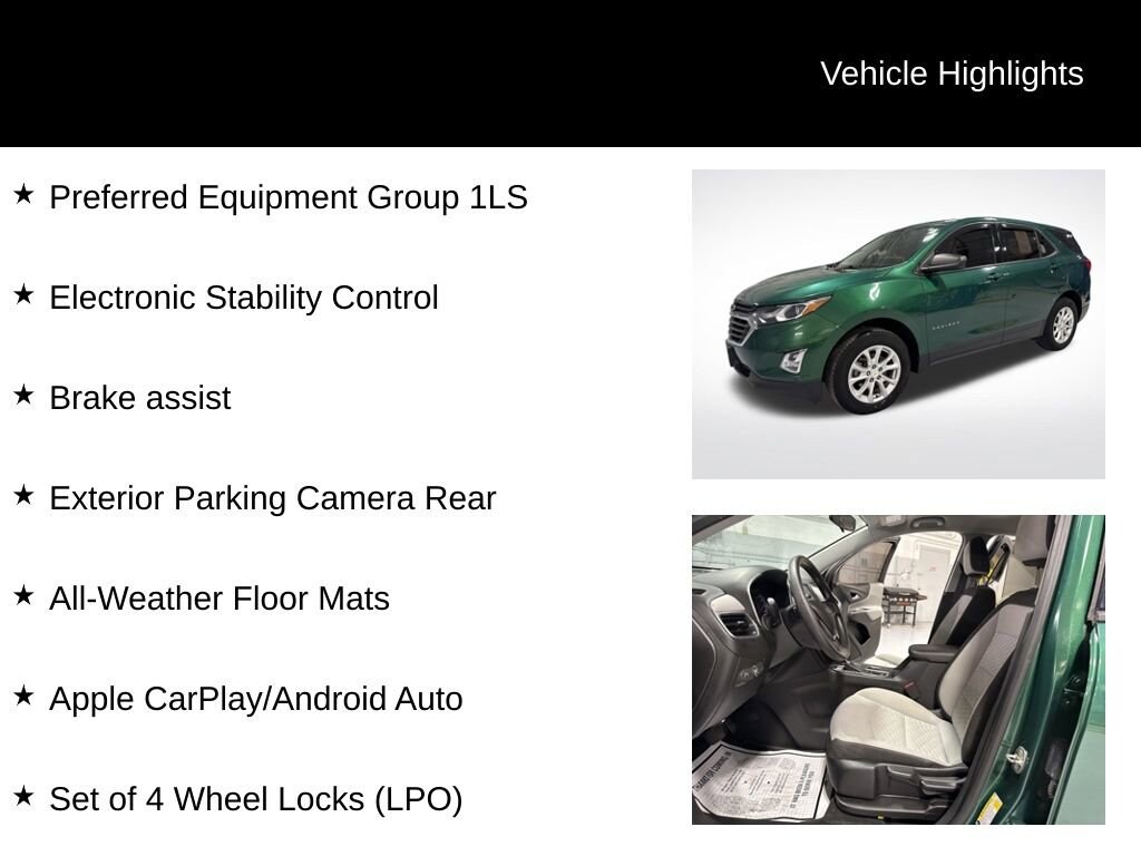 Additionally, this Equinox boasts a suite of advanced technologies and safety features, including Brake Assist, Electronic Stability Control, Exterior Parking Camera Rear, Apple CarPlay/Android Auto, and a Set of 4 Wheel Locks.