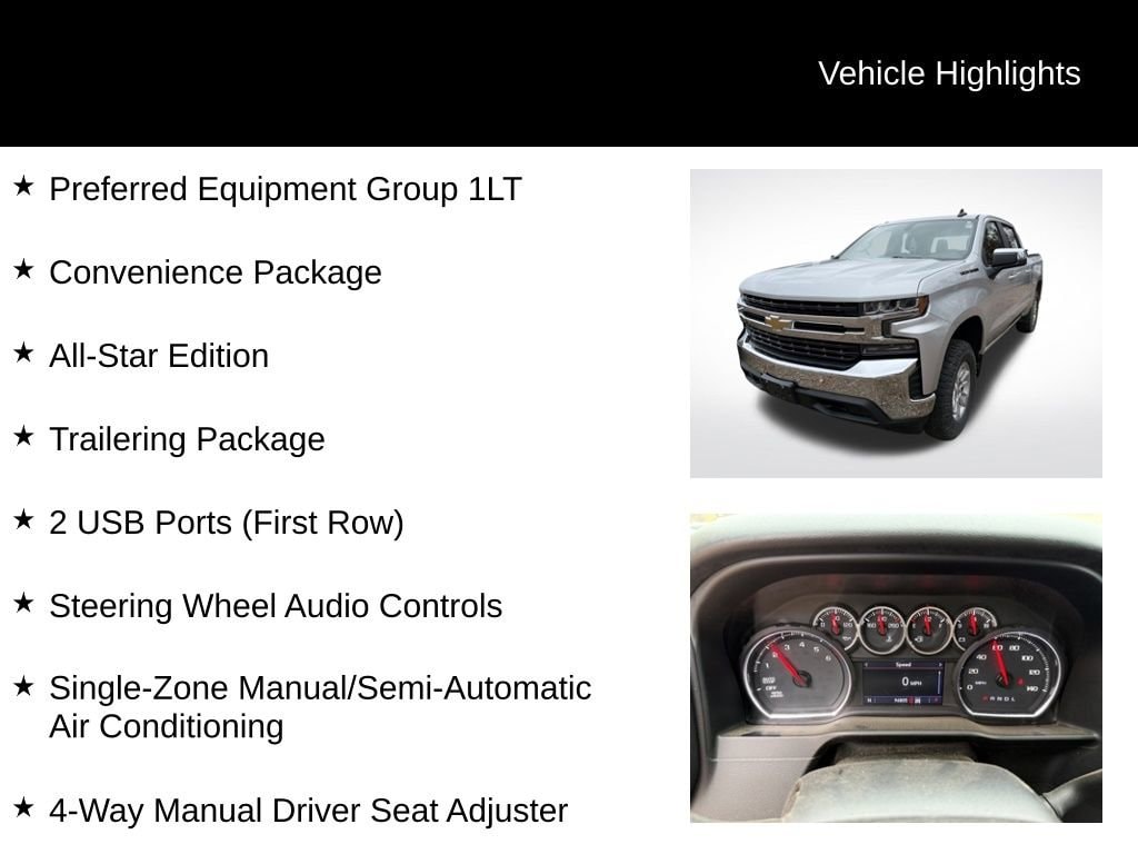 8-Speed Automatic, 4WD, Black Cloth, 2 USB Ports (First Row), 4-Way Manual Driver Seat Adjuster, 4.2 Diagonal Color Display Driver Info Center, All-Star Edition, Bluetooth® For Phone, Chrome Grille, Chrome Mirror Caps, Color-Keyed Carpeting Floor Covering, Compass, Convenience Package, Deep-Tinted Glass, Electronic Cruise Control, Front Frame-Mounted Black Recovery Hooks, Front Rubberized Vinyl Floor Mats, Heavy-Duty Rear Locking Differential, Locking Tailgate, Manual Tilt Wheel Steering Column, OnStar & Chevrolet Connected Services Capable, Power Door Locks, Power Front Windows w/Driver Express Up/Down, Power Front Windows w/Passenger Express Down, Power Rear Windows w/Express Down, Preferred Equipment Group 1LT, Rear 60/40 Folding Bench Seat (Folds Up), Rear Rubberized-Vinyl Floor Mats, Rear Vision Camera, Remote Keyless Entry, Single-Zone Manual/Semi-Automatic Air Conditioning, Steering Wheel Audio Controls, Trailering Package, Urethane Steering Wheel.