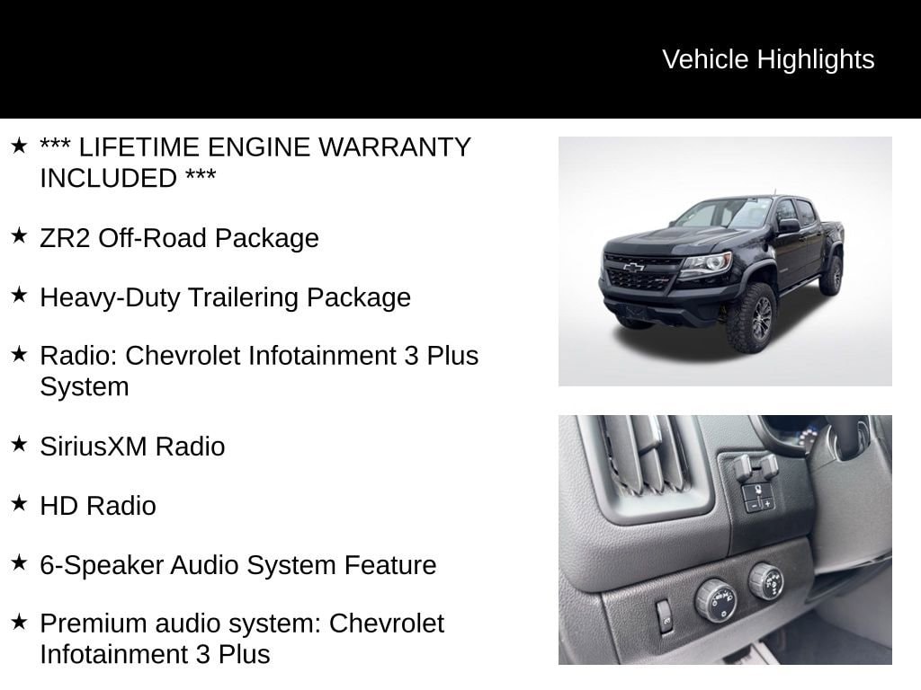 Priced below KBB Fair Purchase Price! Odometer is 18042 miles below market average!Black 2020 Chevrolet Colorado ZR2 4D Crew Cab 4WD V6 8-Speed AutomaticCertified. Chevrolet Certified Pre-Owned Details:* Warranty Deductible: $0* Vehicle History* 24 months/24,000 miles (whichever comes first) Certified Pre-Owned Scheduled Maintenance Plan and 3 days/150 miles (whichever comes first) Vehicle Exchange Program. SiriusXM 3-month trial subscription.* 172 Point Inspection* Powertrain Limited Warranty: 72 Month/100,000 Mile (whichever comes first) from original in-service date* Transferable Warranty* Limited Warranty: 12 Month/12,000 Mile (whichever comes first) from certified purchase date* Roadside Assistance*** LIFETIME ENGINE WARRANTY INCLUDED ***, 4WD, 17 x 8 Aluminum Wheels, 6-Speaker Audio System Feature, Apple CarPlay, HD Radio, Heavy-Duty Trailering Package, Premium audio system: Chevrolet Infotainment 3 Plus, Radio: Chevrolet Infotainment 3 Plus System, SiriusXM Radio, ZR2 Off-Road Package.Please inquire for a personalized Video Walk-Around of this vehicle! Nationwide shipping available!Chevrolet of Wooster stands out as a top-tier Chevy dealership in the area, renowned for its extensive selection of new and used vehicles, a dedicated team of knowledgeable sales professionals, and a stellar service department that prioritizes customer satisfaction. They are widely recognized for their commitment to providing a transparent and friendly car buying experience, with a focus on understanding individual needs and tailoring options accordingly, while also offering competitive pricing and a strong reputation for quality maintenance and repairs. Whether you're looking for a new Chevy truck, a reliable used car, or expert service, Chevrolet of Wooster consistently delivers a positive experience for drivers in the Wooster community. Key points: Large vehicle selection: Wide variety of new and used Chevrolet models to choose from. Knowledgeable staff: Experienced sales team ready to answer questions and guide customers. Quality service department: Reliable maintenance and repair services for all Chevrolet vehicles. Customer-centric approach: Prioritizing customer satisfaction and building long-term relationships. Community involvement: Active presence and support for local initiatives in the Wooster area. We carry All Makes and Models** We have other vehicles with Apple CarPlay, Android Auto, Heads Up Display, Lane Departure System, Blind Spot Monitor, Heated Steering Wheel, Remote Start, Navigation, Rear Entertainment System, DVD Player, 3rd Row Seats, Backup Camera, Panoramic Sunroof, Bluetooth, Hands-Free, Adaptive Cruise Control, Leather Seats, Keyless Entry, Heated Seats, Tow Hitch, Tow Hooks, 4-Wheel Drive and All-wheel Drive, Active Park Assist, 360 degree Surround View Camera, Brake Assist, Power Liftgate, Third Row Seating, Keyless Entry. Although every reasonable effort has been made to ensure the accuracy of the information contained on this site, absolute accuracy cannot be guaranteed.