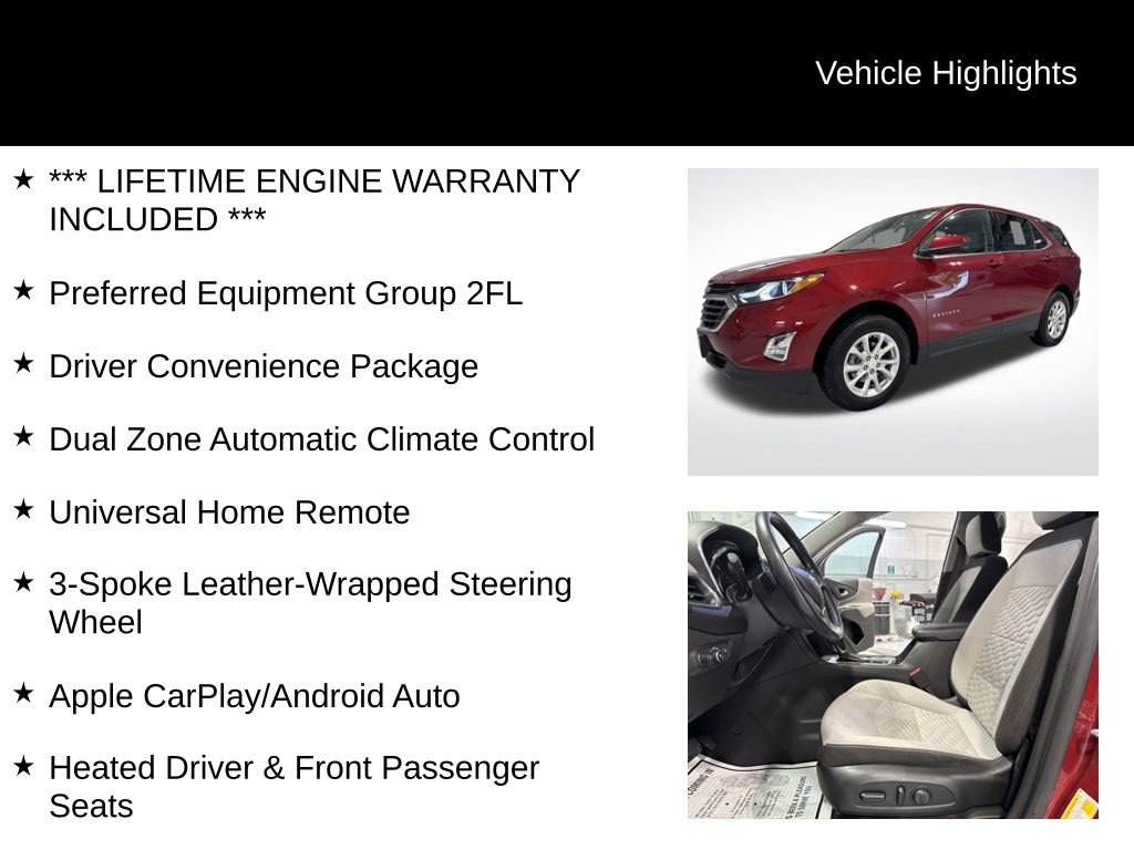 *** LIFETIME ENGINE WARRANTY INCLUDED ***, AWD, 3-Spoke Leather-Wrapped Steering Wheel, Apple CarPlay/Android Auto, Driver Convenience Package, Dual Zone Automatic Climate Control, Heated Driver & Front Passenger Seats, Preferred Equipment Group 2FL, Universal Home Remote, 17 Aluminum Wheels, 2-Way Power Driver Lumbar Control Seat Adjuster, 3.87 Final Drive Axle Ratio, 4-Wheel Disc Brakes, 8-Way Power Driver Seat Adjuster, ABS brakes, Auto High-beam Headlights, Brake assist, Delay-off headlights, Dual front impact airbags, Dual front side impact airbags, Electronic Stability Control, Emergency communication system: OnStar and Chevrolet connected services capable, Four wheel independent suspension, Front anti-roll bar, Front Bucket Seats, Front Fog Lamps, Front Passenger 4-Way Manual Seat Adjuster, Fully automatic headlights, Heated door mirrors, High-Intensity Discharge Headlights, Illuminated entry, Low tire pressure warning, Occupant sensing airbag, Outside temperature display, Overhead airbag, Panic alarm, Power door mirrors, Power driver seat, Power steering, Premium audio system: Chevrolet Infotainment 3, Premium Cloth Seat Trim, Radio: Chevrolet Infotainment 3 System w/AM/FM, Rear anti-roll bar, Rear Power Liftgate, Rear window wiper, Remote keyless entry, Remote Start, Security system, SiriusXM Radio, Speed control, Speed-sensing steering, Split folding rear seat, Telescoping steering wheel, Tilt steering wheel, Traction control, Trip computer, Variably intermittent wipers, AWD, 3-Spoke Leather-Wrapped Steering Wheel, Apple CarPlay/Android Auto, Driver Convenience Package, Dual Zone Automatic Climate Control, Heated Driver & Front Passenger Seats, Preferred Equipment Group 2FL, Universal Home Remote.