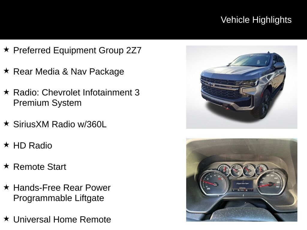 4WD, Black Leather, 1st & 2nd Row Color-Keyed Carpeted Floor Mats, 2 USB Data Ports, 2-Speed Active Electronic AutoTrac Transfer Case, Auto-Dimming Inside Rear-View Mirror, Black Tubular Assist Steps, Bright Front & Rear Door Sill Plates, Color-Keyed Carpeting Floor Covering, Driver & Front Outboard Passenger Airbags, Floor Console w/Storage Area, Front High-Approach Angle Fascia, Hands-Free Rear Power Programmable Liftgate, HD Radio, Hill Descent Control, Infotainment Display, Leather-Wrapped Steering Wheel, LED Daytime Running Lamps, Memory Settings for Driver, Preferred Equipment Group 2Z7, Radio: Chevrolet Infotainment 3 Premium System, Rear Media & Nav Package, Rear Seat Media System, Red Horizontal-Mounted Recovery Hooks, Remote Start, SiriusXM Radio w/360L, Universal Home Remote, Wheels: 20 x 9 Machined Aluminum.