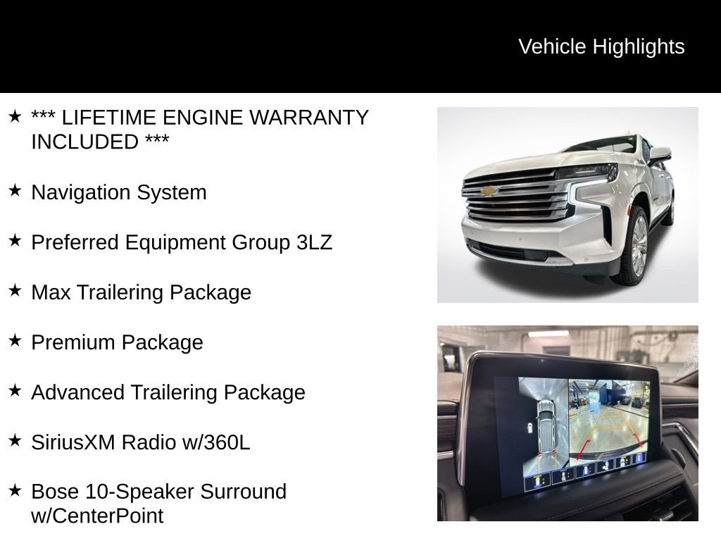 *** LIFETIME ENGINE WARRANTY INCLUDED ***, 15 Diagonal Multi-Color Head-Up Display, 1st & 2nd Row Color-Keyed Carpeted Floor Mats, 2-Speed Active Electronic AutoTrac Transfer Case, 3rd Row 60/40 Power-Folding Split-Bench, Adaptive Cruise Control, Advanced Trailering Package, Automatic Stop/Start, Bose 10-Speaker Surround w/CenterPoint, Bright Front & Rear Door Sill Plates, Chrome Door Handles w/Body-Color Strip, Color-Keyed Carpeting Floor Covering, Driver & Front Outboard Passenger Airbags, Dual Exhaust System, Dual-Pane Power Panoramic Sunroof, Enhanced Driver Information Center, Floor Console, Front & Rear Park Assist, Hands-Free Rear Power Programmable Liftgate, HD Surround Vision, Heated & Ventilated Driver & Front Passenger Seats, Heated 2nd Row Outboard Seats, Heated Driver & Front Passenger Seats, Heated Steering Wheel, Hill Descent Control, Hitch Guidance w/Hitch View, Infotainment Display, Inside Rearview Auto-Dimming Rear Camera Mirror, Integrated Trailer Brake Controller, Lane Change Alert w/Side Blind Zone Alert, Leather-Wrapped Steering Wheel, LED Daytime Running Lamps, Max Trailering Package, Memory Settings, Navigation System, Outside Heated Power-Adjustable Mirrors, Power Release 2nd Row Bucket Seats, Power Tilt & Telescopic Steering Column, Power-Retractable Assist Steps, Preferred Equipment Group 3LZ, Premium Package, Rear Camera Mirror Washer, Rear Cross Traffic Alert, Rear Pedestrian Alert, Remote Start, Safety Alert Seat, SiriusXM Radio w/360L, Smart Trailer Integration Indicator, Start/Stop System Disable Button, Trailer Side Blind Zone Alert, Universal Home Remote, Wireless Charging.