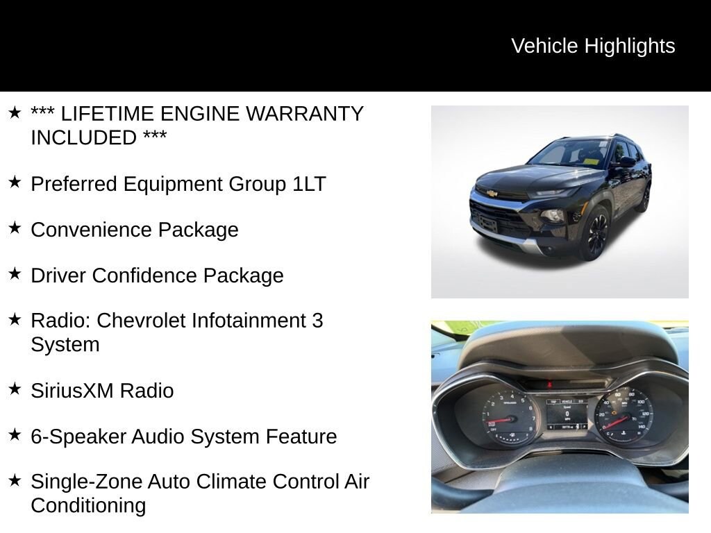 Recent Arrival!Mosaic Black Metallic 2022 Chevrolet TrailBlazer LT 4D Sport Utility FWD 1.3L Ecotec Turbo DOHC SIDI w/VVT CVT*** LIFETIME ENGINE WARRANTY INCLUDED ***, 1 Type-A & 1 Type-C USB Charging-Only Ports, 120-Volt Power Outlet, 6-Speaker Audio System Feature, 8 Diagonal Color Touchscreen Display, Convenience Package, Driver & Front Passenger Illuminated Vanity Mirrors, Driver Confidence Package, Heated door mirrors, Inside Rear-View Auto-Dimming Mirror, Lane Change Alert w/Side Blind Zone Alert, Preferred Equipment Group 1LT, Radio: Chevrolet Infotainment 3 System, Rear Cross Traffic Alert, Rear Park Assist, Ride & Handling Suspension, Single-Zone Auto Climate Control Air Conditioning, SiriusXM Radio, Wheels: 17 High Gloss Black Machined Aluminum, Wireless Apple CarPlay/Android Auto.Please inquire for a personalized Video Walk-Around of this vehicle! Nationwide shipping available!Chevrolet of Wooster stands out as a top-tier Chevy dealership in the area, renowned for its extensive selection of new and used vehicles, a dedicated team of knowledgeable sales professionals, and a stellar service department that prioritizes customer satisfaction. They are widely recognized for their commitment to providing a transparent and friendly car buying experience, with a focus on understanding individual needs and tailoring options accordingly, while also offering competitive pricing and a strong reputation for quality maintenance and repairs. Whether you're looking for a new Chevy truck, a reliable used car, or expert service, Chevrolet of Wooster consistently delivers a positive experience for drivers in the Wooster community. Key points: Large vehicle selection: Wide variety of new and used Chevrolet models to choose from. Knowledgeable staff: Experienced sales team ready to answer questions and guide customers. Quality service department: Reliable maintenance and repair services for all Chevrolet vehicles. Customer-centric approach: Prioritizing customer satisfaction and building long-term relationships. Community involvement: Active presence and support for local initiatives in the Wooster area. We carry All Makes and Models** We have other vehicles with Apple CarPlay, Android Auto, Heads Up Display, Lane Departure System, Blind Spot Monitor, Heated Steering Wheel, Remote Start, Navigation, Rear Entertainment System, DVD Player, 3rd Row Seats, Backup Camera, Panoramic Sunroof, Bluetooth, Hands-Free, Adaptive Cruise Control, Leather Seats, Keyless Entry, Heated Seats, Tow Hitch, Tow Hooks, 4-Wheel Drive and All-wheel Drive, Active Park Assist, 360 degree Surround View Camera, Brake Assist, Power Liftgate, Third Row Seating, Keyless Entry. Although every reasonable effort has been made to ensure the accuracy of the information contained on this site, absolute accuracy cannot be guaranteed.