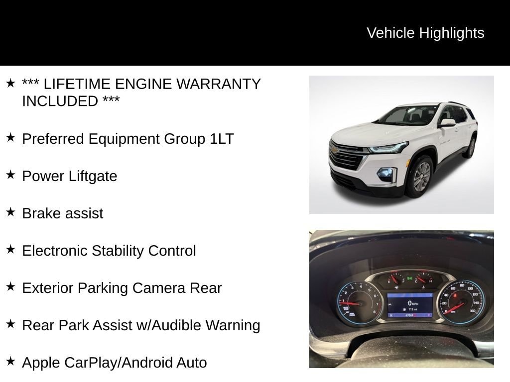 Recent Arrival!Summit White 2022 Chevrolet Traverse LT 1LT 4D Sport Utility AWD 3.6L V6 SIDI VVT 9-Speed Automatic*** LIFETIME ENGINE WARRANTY INCLUDED ***, AWD, Apple CarPlay/Android Auto, Brake assist, Electronic Stability Control, Exterior Parking Camera Rear, Heated Driver & Front Passenger Seats, Power Liftgate, Preferred Equipment Group 1LT, Rear Park Assist w/Audible Warning, Wheels: 18 Bright Silver-Painted Aluminum.Please inquire for a personalized Video Walk-Around of this vehicle! Nationwide shipping available!Chevrolet of Wooster stands out as a top-tier Chevy dealership in the area, renowned for its extensive selection of new and used vehicles, a dedicated team of knowledgeable sales professionals, and a stellar service department that prioritizes customer satisfaction. They are widely recognized for their commitment to providing a transparent and friendly car buying experience, with a focus on understanding individual needs and tailoring options accordingly, while also offering competitive pricing and a strong reputation for quality maintenance and repairs. Whether you're looking for a new Chevy truck, a reliable used car, or expert service, Chevrolet of Wooster consistently delivers a positive experience for drivers in the Wooster community. Key points: Large vehicle selection: Wide variety of new and used Chevrolet models to choose from. Knowledgeable staff: Experienced sales team ready to answer questions and guide customers. Quality service department: Reliable maintenance and repair services for all Chevrolet vehicles. Customer-centric approach: Prioritizing customer satisfaction and building long-term relationships. Community involvement: Active presence and support for local initiatives in the Wooster area. We carry All Makes and Models** We have other vehicles with Apple CarPlay, Android Auto, Heads Up Display, Lane Departure System, Blind Spot Monitor, Heated Steering Wheel, Remote Start, Navigation, Rear Entertainment System, DVD Player, 3rd Row Seats, Backup Camera, Panoramic Sunroof, Bluetooth, Hands-Free, Adaptive Cruise Control, Leather Seats, Keyless Entry, Heated Seats, Tow Hitch, Tow Hooks, 4-Wheel Drive and All-wheel Drive, Active Park Assist, 360 degree Surround View Camera, Brake Assist, Power Liftgate, Third Row Seating, Keyless Entry. Although every reasonable effort has been made to ensure the accuracy of the information contained on this site, absolute accuracy cannot be guaranteed.