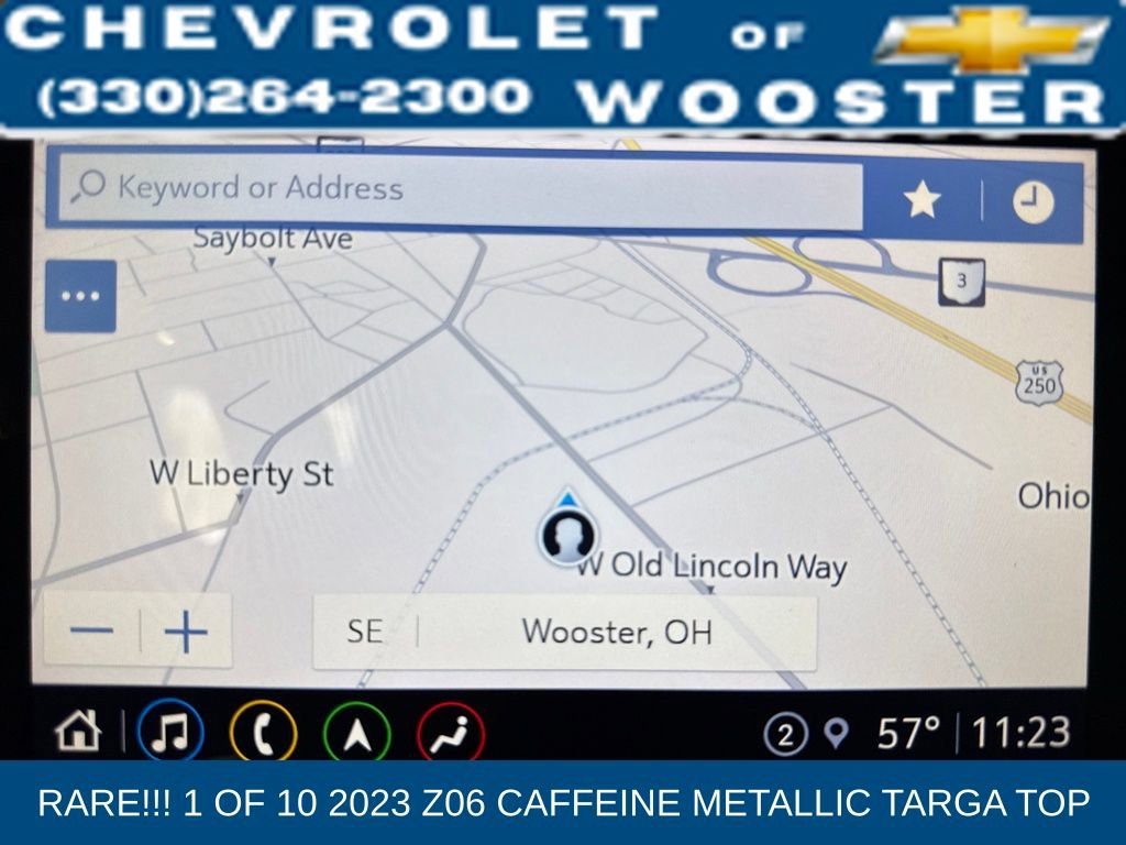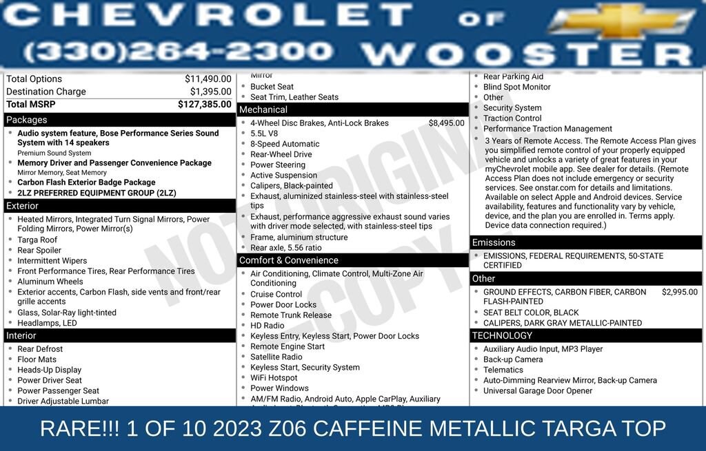 2023 Chevrolet Corvette Z06 Coupe 2LZ | Carbon Fiber Bose® Track-Ready Performance ?????The 2023 Corvette Z06 Coupe 2LZ is the most extreme production Corvette ever built a true American supercar engineered for the track and refined for the street. With its hand-built flat-plane crank V8, premium 2LZ equipment, and carbon fiber accents, this Z06 delivers exotic-level performance with unmistakable Corvette heritage.?? Caffeine Metallic Exterior?? Natural Leather Interior?? Carbon Flash Exterior Accents?? 5.5L Naturally Aspirated Flat-Plane Crank V8?? 8-Speed Automatic Transmission?? Rear-Wheel DrivePerformance & Engineering? 5.5L LT6 Flat-Plane Crank V8? 4-Wheel Disc Brakes w/ ABS? Performance Traction Management? Active Suspension? Aluminum Space Frame? Performance Stainless-Steel Exhaust? Black-Painted Brake Calipers2LZ Preferred Equipment Group? Heated & Leather-Wrapped Steering Wheel? Head-Up Display? Power Driver & Passenger Seats? Heated & Cooled Front Seats? Driver & Passenger Memory Package? Premium Interior TrimPremium Packages & Options? Bose® Performance Series Sound System (14 Speakers) ??? Carbon Flash Exterior Badge Package? Carbon Fiber Ground Effects? Memory Driver & Passenger Convenience PackageExterior Highlights? Carbon Flash Side Vents & Grille Accents? LED Headlamps? Power Folding Heated Mirrors w/ Turn Signals? Rear Spoiler? Performance Tires (Front & Rear)? Targa RoofTechnology & Connectivity? Chevrolet Infotainment System? Apple CarPlay® & Android Auto ? Navigation System? Bluetooth® Connectivity? WiFi Hotspot Capability? Back-Up Camera? Universal Garage Door OpenerSafety & Driver Assistance? Blind Spot Monitoring? Rear Park Assist? Cross-Traffic Alert? Stability & Traction Control? Full Airbag System? Performance Traction ManagementWhy This Corvette Z06?This Z06 2LZ delivers race-bred performance, luxury-grade comfort, and head-turning presence. From the flat-plane V8 scream to its carbon fiber enhancements, this Corvette stands shoulder-to-shoulder with European exotics at a fraction of the ownership cost.?? Chevy of Wooster Performance, Precision, Passion?? Financing Available | ?? Trades Welcome?? Call or TEXT today to schedule your private showing