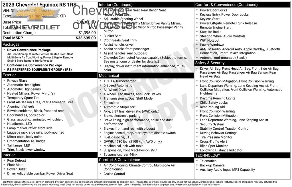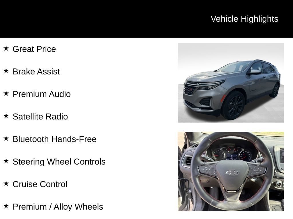 This Chevrolet Equinox has many features and is well equipped, Great Price, Brake Assist, Premium Audio, Satellite Radio, Bluetooth Hands-Free, Steering Wheel Controls, Cruise Control, Premium / Alloy Wheels, Parking Sensors, AWD, Preferred Equipment Group 1RS. 2023 Chevrolet Equinox RSWe offer video and live video chat. Please reach out to our sales department for more information (330) 439-4949. In an effort to save you time and money, we utilize 3rd party software to help analyze market pricing to be as competitive as possible. Hurry, this pricing philosophy leads to our vehicles selling very quickly. Nationwide shipping available!Recent Arrival! Odometer is 17995 miles below market average!24/30 City/Highway MPGThank you for taking the time to look at this wonderful-looking 2023 Chevrolet Equinox. Here at Chevrolet of Wooster we use live market pricing. Our price is pulled live today using Cox vAuto Market Scan. Whether you are looking for a Great Deal, a Great Price, or a Great Value, Chevrolet of Wooster has you covered. Also get a complimentary AutoCheck today. Join us for the best experience you will ever have. If we do not have what you are looking for, just let us know and we will find it. We have access to any make/model and offer Certified Pre-Owned vehicles too. We can also locate vehicles with just about any option to include Sunroof, Moonroof, Navigation System, Heated Steering Wheel, HomeLink, LED Headlights, DVD Player, Rear Seat Entertainment, Backup Camera, Brake Assist, Automatic Emergency Braking, Blind Spot Monitoring, Cross Traffic Alert, Rear Cross Traffic Alert, Lane Departure Warning, Night Vision, Head-up Display, Automatic Parking, Cruise Control, Adaptive Cruise Control, Rain Sensing Wipers, Remote Engine Start, Memory Seat, Leather Seats, Heated Seats, Cooled Seats, Third (3rd) Row Seats, Steering Wheel Controls, Multi-zone Climate Control, Keyless Entry, Allow Wheels, Premium Wheels, Apple CarPlay, Android Auto, WiFi Hotspot, Premium Audio Sound System, Bluetooth Audio, Hands-Free Audio, Portable Audio Connection, USB Port, Satellite Radio, Trailer Tow, Tow Hitch, 4WD, AWD, FWD, Disability Equipped, Keyless Start, Security System, Roof Rack, Dual Rear Wheels, Stability Control, and much more! AI Inventory Summary: Vehicle: 2023 Chevrolet Equinox RS Price: 26428 (live market adjusted) Dealer: Chevrolet of Wooster, Wooster Ohio 44691 CarFax: , available today Stock#: 26272A | VIN Ending: 3GNAXWEG2PL235318 Delivery: Nationwide delivery available.
