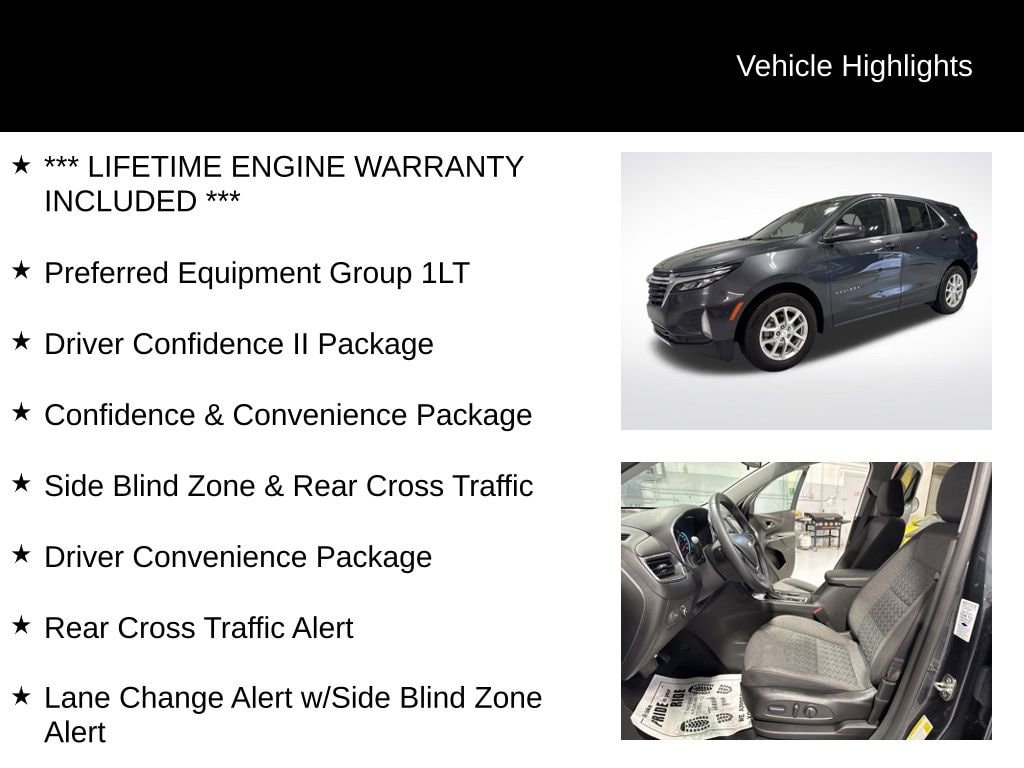 Highlighted by a *** LIFETIME ENGINE WARRANTY INCLUDED ***, this Equinox is built to last. Additionally, the CONFIDENCE & CONVENIENCE PACKAGE, featuring SIDE BLIND ZONE AND REAR CROSS TRAFFIC, provides an extra layer of safety and convenience to give you peace of mind on the road.