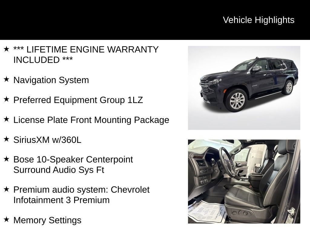 *** LIFETIME ENGINE WARRANTY INCLUDED ***, 4WD, Black Leather, 1st & 2nd Row Color-Keyed Carpeted Floor Mats, 2-Speed Active Electronic AutoTrac Transfer Case, 20 x 9 Polished Aluminum Wheels, 3rd Row 60/40 Power-Folding Split-Bench Seat, Apple CarPlay/Android Auto, Auto-Dimming Inside Rear-View Mirror, Bose 10-Speaker Centerpoint Surround Audio Sys Ft, Bright Front & Rear Door Sill Plates, Chrome Door Handles w/Body-Color Strip, Chrome Mirror Caps, Color-Keyed Carpeting Floor Covering, Driver & Front Outboard Passenger Airbags, Dual Exhaust System, Enhanced Driver Information Center, Floor Console, Hands-Free Rear Power Programmable Liftgate, Heated 2nd Row Outboard Seats, Heated Steering Wheel, Hill Descent Control, Lane Change Alert w/Side Blind Zone Alert, LED Daytime Running Lamps, License Plate Front Mounting Package, Memory Settings, Navigation System, Outside Heated Power-Adjustable Mirrors, Power Release 2nd Row Bucket Seats, Power Tilt & Telescopic Steering Column, Preferred Equipment Group 1LZ, Premium audio system: Chevrolet Infotainment 3 Premium, Rear Cross Traffic Alert, Remote Start, Safety Alert Seat, SiriusXM w/360L, Universal Home Remote, Wireless Charging, Wrapped Steering Wheel.