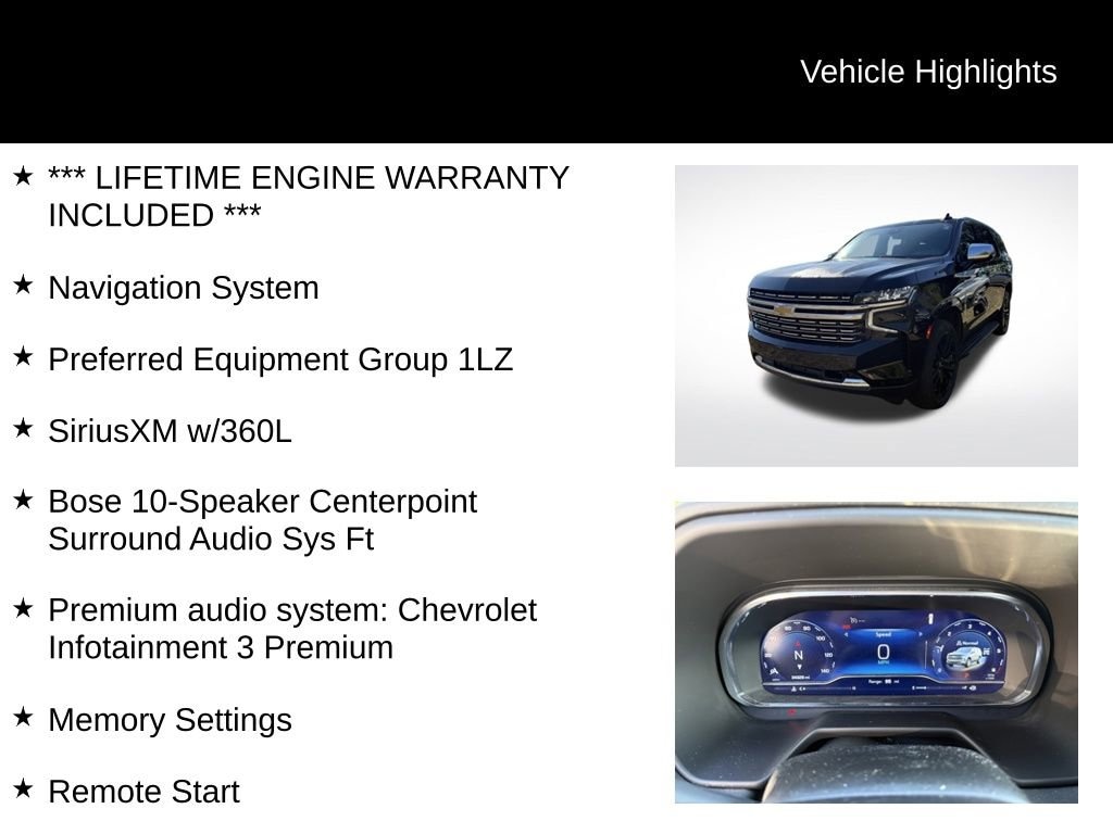 *** LIFETIME ENGINE WARRANTY INCLUDED ***, 4WD, Jet Black Leather, 1st & 2nd Row Color-Keyed Carpeted Floor Mats, 1st & 2nd Rows All-Weather Floor Liners (LPO), 2-Speed Active Electronic AutoTrac Transfer Case, 3rd Row 60/40 Power-Folding Split-Bench Seat, Apple CarPlay/Android Auto, Auto-Dimming Inside Rear-View Mirror, Bose 10-Speaker Centerpoint Surround Audio Sys Ft, Bright Front & Rear Door Sill Plates, Chrome Door Handles w/Body-Color Strip, Chrome Mirror Caps, Color-Keyed Carpeting Floor Covering, Driver & Front Outboard Passenger Airbags, Dual Exhaust System, Dual-Pane Power Panoramic Sunroof, Enhanced Driver Information Center, Floor Console, Hands-Free Rear Power Programmable Liftgate, Heated 2nd Row Outboard Seats, Heated Steering Wheel, Hill Descent Control, Lane Change Alert w/Side Blind Zone Alert, LED Daytime Running Lamps, Memory Settings, Navigation System, Outside Heated Power-Adjustable Mirrors, Power Release 2nd Row Bucket Seats, Power Tilt & Telescopic Steering Column, Preferred Equipment Group 1LZ, Premium audio system: Chevrolet Infotainment 3 Premium, Rear Cross Traffic Alert, Remote Start, Safety Alert Seat, SiriusXM w/360L, Universal Home Remote, Wheels: 22 Multi-Spoke Gloss Black (LPO), Wireless Charging, Wrapped Steering Wheel.