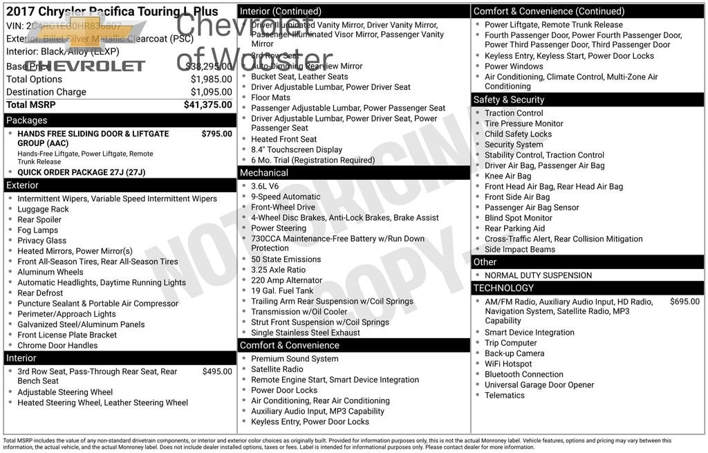 This 2017 Pacifica Touring L Plus delivers premium comfort, family-friendly versatility, and modern tech. With heated leather, power sliding doors, hands-free liftgate, and a large touchscreen, itâs the perfect minivan for families, travel, and everyday life.