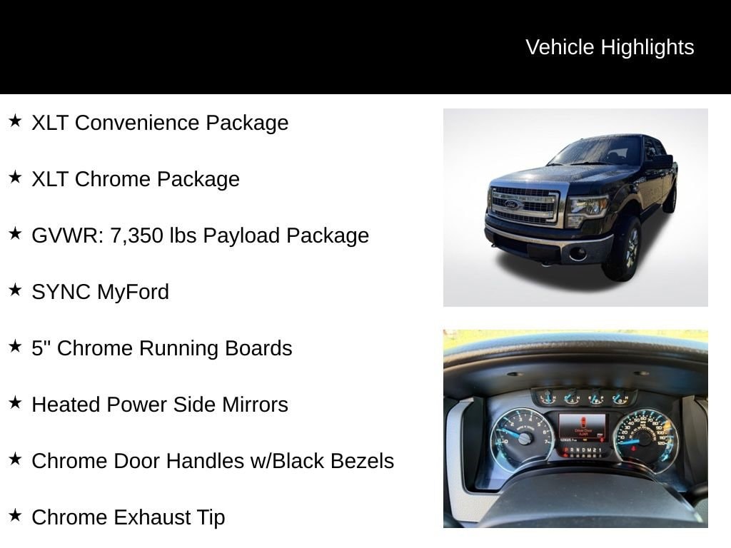 Recent Arrival! Odometer is 8637 miles below market average!Tuxedo Black Metallic 2014 Ford F-150 XLT 4D SuperCrew 4WD 5.0L V8 FFV 6-Speed Automatic Electronic4WD, 18 Chrome-Clad Aluminum Wheels, 5 Chrome Running Boards, 6-Way Power Driver Seat, Chrome Door Handles w/Black Bezels, Chrome Exhaust Tip, GVWR: 7,350 lbs Payload Package, Heated Power Side Mirrors, Leather-Wrapped Steering Wheel, Power Adjustable Pedals, SYNC MyFord, XLT Chrome Package, XLT Convenience Package, 17 Machined-Aluminum w/Painted Accents Wheels, 3.55 Axle Ratio, 4 Speakers, 4-Wheel Disc Brakes, ABS brakes, Air Conditioning, Alloy wheels, AM/FM radio, Bumpers: chrome, CD player, Cloth 40/20/40 Front Seat, Compass, Delay-off headlights, Driver door bin, Driver vanity mirror, Dual front impact airbags, Dual front side impact airbags, Electronic Stability Control, Front anti-roll bar, Front Center Armrest w/Storage, Front fog lights, Front reading lights, Front wheel independent suspension, Fully automatic headlights, Illuminated entry, Low tire pressure warning, Occupant sensing airbag, Outside temperature display, Overhead airbag, Overhead console, Panic alarm, Passenger door bin, Passenger vanity mirror, Power door mirrors, Power steering, Power windows, Radio data system, Radio: AM/FM Stereo/Single-CD Player w/Clock, Rear reading lights, Rear step bumper, Remote keyless entry, Security system, Speed control, Speed-sensing steering, Split folding rear seat, Steering wheel mounted audio controls, SYNC Voice Activated Communication & Entertainment, Tachometer, Tilt steering wheel, Traction control, Variably intermittent wipers, 4WD, 18 Chrome-Clad Aluminum Wheels, 5 Chrome Running Boards, 6-Way Power Driver Seat, Chrome Door Handles w/Black Bezels, Chrome Exhaust Tip, GVWR: 7,350 lbs Payload Package, Heated Power Side Mirrors, Leather-Wrapped Steering Wheel, Power Adjustable Pedals, SYNC MyFord, XLT Chrome Package, XLT Convenience Package.Please inquire for a personalized Video Walk-Around of this vehicle! Nationwide shipping available!Chevrolet of Wooster stands out as a top-tier Chevy dealership in the area, renowned for its extensive selection of new and used vehicles, a dedicated team of knowledgeable sales professionals, and a stellar service department that prioritizes customer satisfaction. They are widely recognized for their commitment to providing a transparent and friendly car buying experience, with a focus on understanding individual needs and tailoring options accordingly, while also offering competitive pricing and a strong reputation for quality maintenance and repairs. Whether you're looking for a new Chevy truck, a reliable used car, or expert service, Chevrolet of Wooster consistently delivers a positive experience for drivers in the Wooster community. Key points: Large vehicle selection: Wide variety of new and used Chevrolet models to choose from. Knowledgeable staff: Experienced sales team ready to answer questions and guide customers. Quality service department: Reliable maintenance and repair services for all Chevrolet vehicles. Customer-centric approach: Prioritizing customer satisfaction and building long-term relationships. Community involvement: Active presence and support for local initiatives in the Wooster area. We carry All Makes and Models** We have other vehicles with Apple CarPlay, Android Auto, Heads Up Display, Lane Departure System, Blind Spot Monitor, Heated Steering Wheel, Remote Start, Navigation, Rear Entertainment System, DVD Player, 3rd Row Seats, Backup Camera, Panoramic Sunroof, Bluetooth, Hands-Free, Adaptive Cruise Control, Leather Seats, Keyless Entry, Heated Seats, Tow Hitch, Tow Hooks, 4-Wheel Drive and All-wheel Drive, Active Park Assist, 360 degree Surround View Camera, Brake Assist, Power Liftgate, Third Row Seating, Keyless Entry. Although every reasonable effort has been made to ensure the accuracy of the information contained on this site, absolute accuracy can