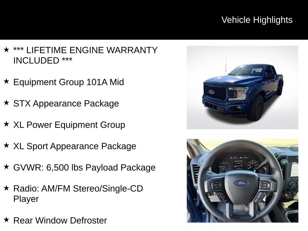 Recent Arrival! Odometer is 54324 miles below market average!Lightning Blue 2018 Ford F-150 XL Super Cab 4WD 2.7L V6 EcoBoost 10-Speed Automatic*** LIFETIME ENGINE WARRANTY INCLUDED ***, 4WD, 20 Machined-Aluminum Wheels, 3.55 Axle Ratio, 4.2 Productivity Screen in Instrument Cluster, Body-Color Front & Rear Bumpers, Body-Color Surround w/Black Mesh Insert Grille, Box Side Decals, Class IV Trailer Hitch Receiver, Cruise Control, Driver/Passenger Seat Back Pocket, Equipment Group 101A Mid, Fog Lamps, GVWR: 6,500 lbs Payload Package, Manual Driver/Passenger Lumbar, Privacy Glass, Radio: AM/FM Stereo/Single-CD Player, Rear Window Defroster, STX Appearance Package, SYNC, SYNC 3, Unique Sport Cloth 40/Console/40 Front-Seats, Wheels: 17 Silver Painted Aluminum, XL Power Equipment Group, XL Sport Appearance Package.Please inquire for a personalized Video Walk-Around of this vehicle! Nationwide shipping available!Chevrolet of Wooster stands out as a top-tier Chevy dealership in the area, renowned for its extensive selection of new and used vehicles, a dedicated team of knowledgeable sales professionals, and a stellar service department that prioritizes customer satisfaction. They are widely recognized for their commitment to providing a transparent and friendly car buying experience, with a focus on understanding individual needs and tailoring options accordingly, while also offering competitive pricing and a strong reputation for quality maintenance and repairs. Whether you're looking for a new Chevy truck, a reliable used car, or expert service, Chevrolet of Wooster consistently delivers a positive experience for drivers in the Wooster community. Key points: Large vehicle selection: Wide variety of new and used Chevrolet models to choose from. Knowledgeable staff: Experienced sales team ready to answer questions and guide customers. Quality service department: Reliable maintenance and repair services for all Chevrolet vehicles. Customer-centric approach: Prioritizing customer satisfaction and building long-term relationships. Community involvement: Active presence and support for local initiatives in the Wooster area. We carry All Makes and Models** We have other vehicles with Apple CarPlay, Android Auto, Heads Up Display, Lane Departure System, Blind Spot Monitor, Heated Steering Wheel, Remote Start, Navigation, Rear Entertainment System, DVD Player, 3rd Row Seats, Backup Camera, Panoramic Sunroof, Bluetooth, Hands-Free, Adaptive Cruise Control, Leather Seats, Keyless Entry, Heated Seats, Tow Hitch, Tow Hooks, 4-Wheel Drive and All-wheel Drive, Active Park Assist, 360 degree Surround View Camera, Brake Assist, Power Liftgate, Third Row Seating, Keyless Entry. Although every reasonable effort has been made to ensure the accuracy of the information contained on this site, absolute accuracy cannot be guaranteed.