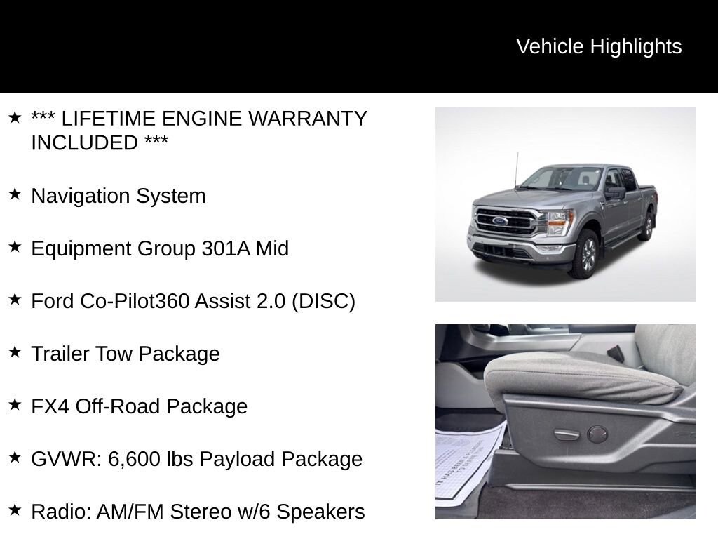 *** LIFETIME ENGINE WARRANTY INCLUDED ***, 4WD, 4x4 FX4 Off-Road Bodyside Decal, 8-Way Power Driver's Seat w/Power Lumbar, 8 Productivity Screen in Instrument Cluster, ABS brakes, Alloy wheels, Auto-Dimming Rear-View Mirror, Class IV Trailer Hitch Receiver, Compass, Connected Built-In Navigation (DISC), Dual Zone Electronic Automatic Temperature Control, Electronic Locking w/3.73 Axle Ratio, Electronic Stability Control, Equipment Group 301A Mid, Evasive Steering Assist, Extended Range 36 Gallon Fuel Tank, Ford Co-Pilot360 Assist 2.0 (DISC), FX4 Off-Road Package, GVWR: 6,600 lbs Payload Package, Heated door mirrors, Heated Front Seats, Hill Descent Control, Illuminated entry, Integrated Trailer Brake Controller, Intelligent Adaptive Cruise Control w/Stop & Go, Intersection Assist, Leather-Wrapped Steering Wheel, LED Box Lighting, Low tire pressure warning, Monotube Rear Shocks, Navigation System, Off-Road Tuned Front Shock Absorbers, Pro Trailer Backup Assist, Radio: AM/FM Stereo w/6 Speakers, Rear Under-Seat Storage, Remote keyless entry, Rock Crawl Mode, SecuriCode Drivers Side Keyless-Entry Keypad, SYNC 4, SYNC 4 w/Enhanced Voice Recognition, Tailgate Step w/Tailgate Work Surface, Traction control, Trailer Tow Package, Tray Style Floor Liner (47W).
