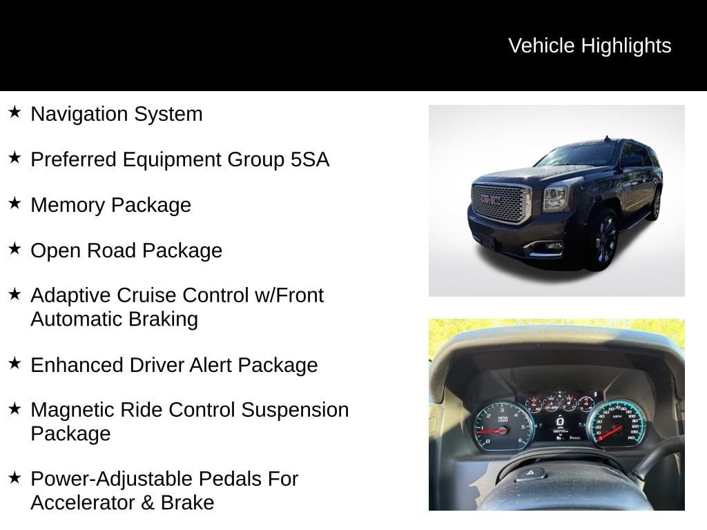 4WD, 17 Disc/Disc VAC Power Brakes, 4-Wheel Disc & 4-Wheel VAC Power Antilock Brakes, 5 Auxiliary 12-volt Power Outlets, Adaptive Cruise Control w/Front Automatic Braking, Automatic Collision Preparation, Black Assist Steps w/Chrome Strip, Enhanced Driver Alert Package, Forward Collision Alert Sensor Indicator, Hands Free Power Liftgate, Heated Leather-Wrapped Steering Wheel, Inside Rear-View Auto-Dimming Mirror, Integrated Trailer Brake Controller, Intellibeam Automatic High Beam On/Off Headlamps, Lane Keep Assist, Low Speed Forward Automatic Braking, Magnetic Ride Control Suspension Package, Memory Package, Navigation System, OnStar Basic Plan For 5 Years, OnStar w/4G LTE, Open Road Package, Passive Entry System, Power Release Second Row Bucket Seats, Power Tilt & Telescopic Steering Column, Power Tilt-Sliding Sunroof w/Express-Open/Close, Power-Adjustable Pedals For Accelerator & Brake, Preferred Equipment Group 5SA, Push Button Keyless Start, Rear Cross-Traffic Alert, Rear Seat Blu-Ray/DVD Entertainment System, Side Blind Zone Alert w/Lane Change Alert, Universal Home Remote, Wireless Charging.