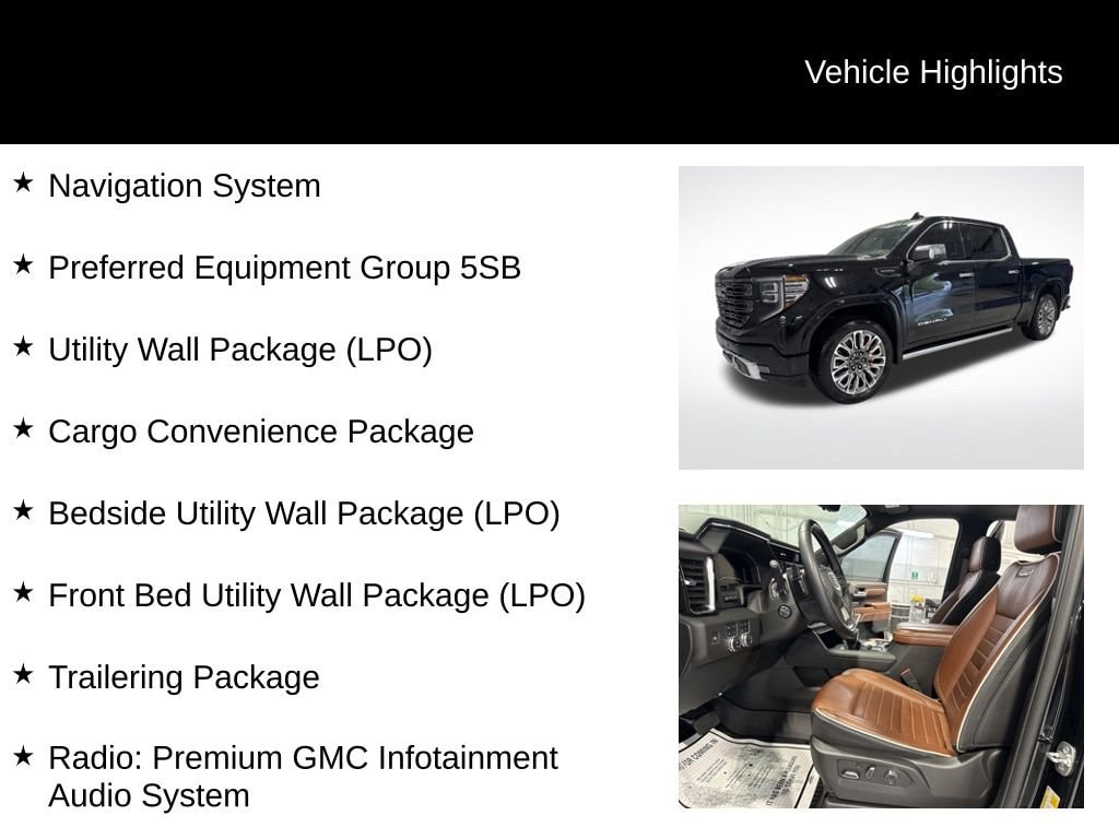10-Speed Automatic, 4WD, Alpine Umber Leather, Apple CarPlay/Android Auto, Auto-Locking Rear Differential, Bed View Camera, Bedside Utility Wall Package (LPO), Bose Premium Series w/12-Speaker System, Cargo Convenience Package, Chrome Recovery Hooks, Console-Mounted Safe (LPO), Front Bed Utility Wall Package (LPO), HD Surround Vision, Heated 2nd Row Outboard Seats, Heated Driver & Front Outboard Passenger Seating, High Gloss Black Header w/Signature Denali Grille, Hitch View, In-Vehicle Trailering System App, Integrated Trailer Brake Controller, Multicolor 15 Diagonal Head-Up Display, MultiPro Tailgate Audio System by Kicker (LPO), Navigation System, OnStar Services Capable, Power Rake & Telescoping Steering Column, Power Sunroof, Preferred Equipment Group 5SB, Radio: Premium GMC Infotainment Audio System, Rear Cross Traffic Braking, Rear Pedestrian Detection, Rear Underseat Storage (LPO), Remote Vehicle Starter System, Spray-On Pickup Bedliner w/GMC Logo, Theft Deterrent System (Unauthorized Entry), Trailer Camera Provisions, Trailer Side Blind Zone Alert, Trailer Tire Pressure Monitor System, Trailering Package, Ultrasonic Front & Rear Park Assist, Universal Home Remote, Utility Wall Latch Kit (LPO), Utility Wall Package (LPO), Ventilated Driver & Front Passenger Seats, Wireless Apple CarPlay/Wireless Android Auto.