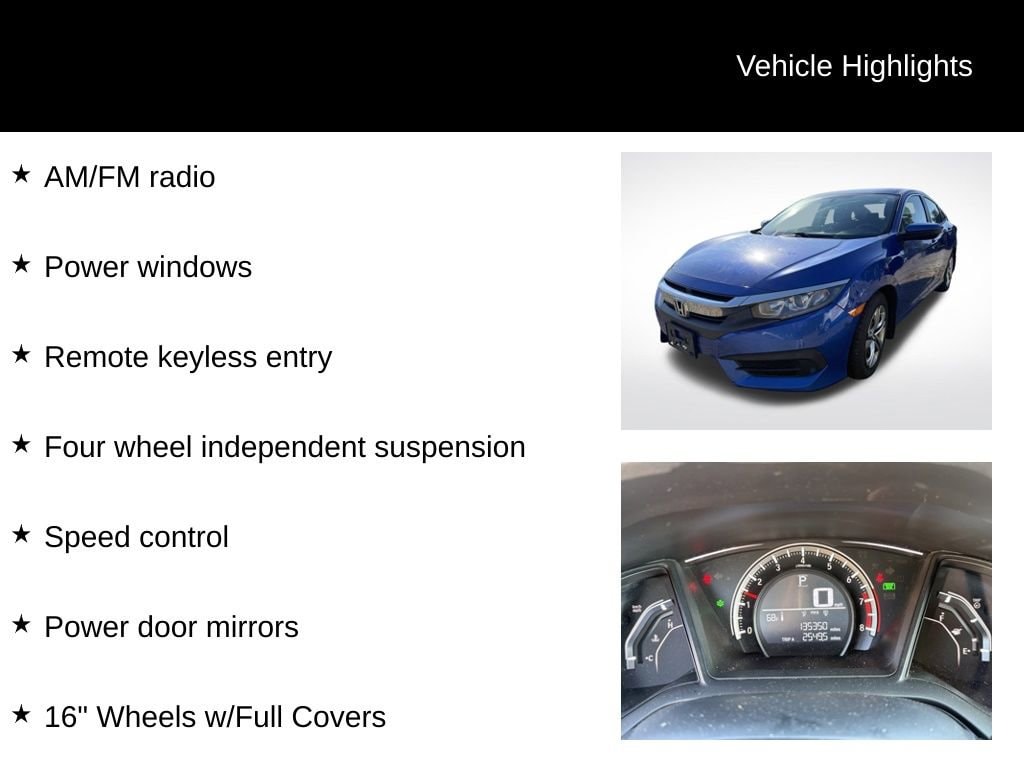 Recent Arrival!2016 Honda Civic LX 4D Sedan FWD 2.0L I4 DOHC 16V i-VTEC CVTCloth, 16 Wheels w/Full Covers, AM/FM radio, Four wheel independent suspension, Power door mirrors, Power windows, Remote keyless entry, Speed control, 4 Speakers, 4-Wheel Disc Brakes, ABS brakes, Air Conditioning, Automatic temperature control, Brake assist, Bumpers: body-color, Cloth Seat Trim, Compass, Delay-off headlights, Driver door bin, Driver vanity mirror, Dual front impact airbags, Dual front side impact airbags, Electronic Stability Control, Exterior Parking Camera Rear, Front anti-roll bar, Front Bucket Seats, Front Center Armrest, Front reading lights, Fully automatic headlights, Illuminated entry, Low tire pressure warning, Occupant sensing airbag, Outside temperature display, Overhead airbag, Panic alarm, Passenger door bin, Passenger vanity mirror, Power steering, Radio data system, Radio: 160-Watt AM/FM Audio System, Rear anti-roll bar, Rear window defroster, Reclining Front Bucket Seats, Security system, Speed-sensing steering, Steering wheel mounted audio controls, Tachometer, Telescoping steering wheel, Tilt steering wheel, Traction control, Cloth, 16 Wheels w/Full Covers, AM/FM radio, Four wheel independent suspension, Power door mirrors, Power windows, Remote keyless entry, Speed control.Please inquire for a personalized Video Walk-Around of this vehicle! Nationwide shipping available!Chevrolet of Wooster stands out as a top-tier Chevy dealership in the area, renowned for its extensive selection of new and used vehicles, a dedicated team of knowledgeable sales professionals, and a stellar service department that prioritizes customer satisfaction. They are widely recognized for their commitment to providing a transparent and friendly car buying experience, with a focus on understanding individual needs and tailoring options accordingly, while also offering competitive pricing and a strong reputation for quality maintenance and repairs. Whether you're looking for a new Chevy truck, a reliable used car, or expert service, Chevrolet of Wooster consistently delivers a positive experience for drivers in the Wooster community. Key points: Large vehicle selection: Wide variety of new and used Chevrolet models to choose from. Knowledgeable staff: Experienced sales team ready to answer questions and guide customers. Quality service department: Reliable maintenance and repair services for all Chevrolet vehicles. Customer-centric approach: Prioritizing customer satisfaction and building long-term relationships. Community involvement: Active presence and support for local initiatives in the Wooster area. We carry All Makes and Models** We have other vehicles with Apple CarPlay, Android Auto, Heads Up Display, Lane Departure System, Blind Spot Monitor, Heated Steering Wheel, Remote Start, Navigation, Rear Entertainment System, DVD Player, 3rd Row Seats, Backup Camera, Panoramic Sunroof, Bluetooth, Hands-Free, Adaptive Cruise Control, Leather Seats, Keyless Entry, Heated Seats, Tow Hitch, Tow Hooks, 4-Wheel Drive and All-wheel Drive, Active Park Assist, 360 degree Surround View Camera, Brake Assist, Power Liftgate, Third Row Seating, Keyless Entry. Although every reasonable effort has been made to ensure the accuracy of the information contained on this site, absolute accuracy cannot be guaranteed.