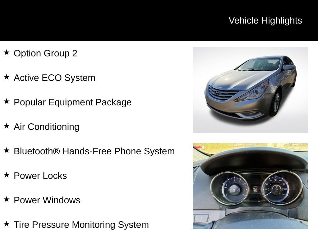 Recent Arrival! Odometer is 18491 miles below market average!Radiant Silver Metallic 2013 Hyundai Sonata GLS 4D Sedan FWD 2.4L 4-Cylinder DGI PZEV 6-Speed Automatic with ShiftronicGray Cloth, Active ECO System, Advanced Trip Computer w/Custom Settings, Air Conditioning, Anti-Lock Braking System (ABS), Blue Link Telematics System, Bluetooth® Hands-Free Phone System, Bodycolor Front Grille, Chrome Window Belt-Line Moldings, Daytime Running Lights, Electronic Stability Control, Front Active Head Restraints, Front Seat Side Impact & Curtain Airbags, Heated Mirrors, Metalgrain Interior Accents, Option Group 2, Popular Equipment Package, Power Locks, Power Windows, Remote Keyless Entry & Alarm, Solar Control Glass, Tilt & Telescopic Steering Wheel, Tire Pressure Monitoring System.Please inquire for a personalized Video Walk-Around of this vehicle! Nationwide shipping available!Chevrolet of Wooster stands out as a top-tier Chevy dealership in the area, renowned for its extensive selection of new and used vehicles, a dedicated team of knowledgeable sales professionals, and a stellar service department that prioritizes customer satisfaction. They are widely recognized for their commitment to providing a transparent and friendly car buying experience, with a focus on understanding individual needs and tailoring options accordingly, while also offering competitive pricing and a strong reputation for quality maintenance and repairs. Whether you're looking for a new Chevy truck, a reliable used car, or expert service, Chevrolet of Wooster consistently delivers a positive experience for drivers in the Wooster community. Key points: Large vehicle selection: Wide variety of new and used Chevrolet models to choose from. Knowledgeable staff: Experienced sales team ready to answer questions and guide customers. Quality service department: Reliable maintenance and repair services for all Chevrolet vehicles. Customer-centric approach: Prioritizing customer satisfaction and building long-term relationships. Community involvement: Active presence and support for local initiatives in the Wooster area. We carry All Makes and Models** We have other vehicles with Apple CarPlay, Android Auto, Heads Up Display, Lane Departure System, Blind Spot Monitor, Heated Steering Wheel, Remote Start, Navigation, Rear Entertainment System, DVD Player, 3rd Row Seats, Backup Camera, Panoramic Sunroof, Bluetooth, Hands-Free, Adaptive Cruise Control, Leather Seats, Keyless Entry, Heated Seats, Tow Hitch, Tow Hooks, 4-Wheel Drive and All-wheel Drive, Active Park Assist, 360 degree Surround View Camera, Brake Assist, Power Liftgate, Third Row Seating, Keyless Entry. Although every reasonable effort has been made to ensure the accuracy of the information contained on this site, absolute accuracy cannot be guaranteed.