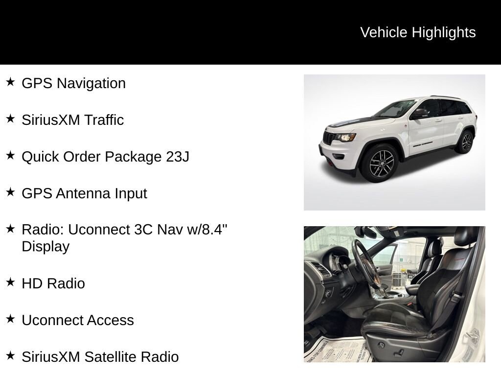 Recent Arrival!Bright White Clearcoat 2017 Jeep Grand Cherokee Trailhawk 4D Sport Utility 4WD 3.6L V6 24V VVT 8-Speed Automatic4WD, 3.45 Rear Axle Ratio, 5-Year SiriusXM Traffic Service, 5-Year SiriusXM Travel Link Service, 8.4 Touchscreen Display, Auto-Dimming Rear-View Mirror, Emergency communication system: Uconnect Access, Four wheel independent suspension, GPS Antenna Input, GPS Navigation, HD Radio, Heated front seats, Instrument Cluster w/Off-Road Disp. Pages, Integrated Voice Command w/Bluetooth, Normal Duty Suspension - Increased Travel, ParkView Rear Back-Up Camera, Power Sunroof, Quick Order Package 23J, Radio: Uconnect 3C Nav w/8.4 Display, Roadside Assistance & 9-1-1 Call, SiriusXM Satellite Radio, SiriusXM Traffic, SiriusXM Travel Link, Trailhawk Leather/Suede Seats, Uconnect Access, Ventilated front seats, Wheels: 18 x 8.0 Off Road Aluminum.Please inquire for a personalized Video Walk-Around of this vehicle! Nationwide shipping available!Chevrolet of Wooster stands out as a top-tier Chevy dealership in the area, renowned for its extensive selection of new and used vehicles, a dedicated team of knowledgeable sales professionals, and a stellar service department that prioritizes customer satisfaction. They are widely recognized for their commitment to providing a transparent and friendly car buying experience, with a focus on understanding individual needs and tailoring options accordingly, while also offering competitive pricing and a strong reputation for quality maintenance and repairs. Whether you're looking for a new Chevy truck, a reliable used car, or expert service, Chevrolet of Wooster consistently delivers a positive experience for drivers in the Wooster community. Key points: Large vehicle selection: Wide variety of new and used Chevrolet models to choose from. Knowledgeable staff: Experienced sales team ready to answer questions and guide customers. Quality service department: Reliable maintenance and repair services for all Chevrolet vehicles. Customer-centric approach: Prioritizing customer satisfaction and building long-term relationships. Community involvement: Active presence and support for local initiatives in the Wooster area. We carry All Makes and Models** We have other vehicles with Apple CarPlay, Android Auto, Heads Up Display, Lane Departure System, Blind Spot Monitor, Heated Steering Wheel, Remote Start, Navigation, Rear Entertainment System, DVD Player, 3rd Row Seats, Backup Camera, Panoramic Sunroof, Bluetooth, Hands-Free, Adaptive Cruise Control, Leather Seats, Keyless Entry, Heated Seats, Tow Hitch, Tow Hooks, 4-Wheel Drive and All-wheel Drive, Active Park Assist, 360 degree Surround View Camera, Brake Assist, Power Liftgate, Third Row Seating, Keyless Entry. Although every reasonable effort has been made to ensure the accuracy of the information contained on this site, absolute accuracy cannot be guaranteed.