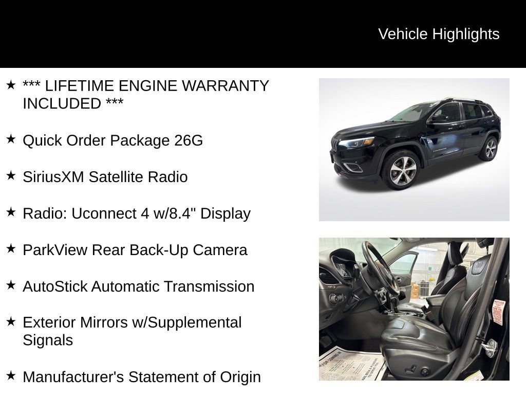 Odometer is 2711 miles below market average!Diamond Black Crystal Pearlcoat 2019 Jeep Cherokee Limited 4D Sport Utility 4WD 3.2L V6 9-Speed 948TE Automatic*** LIFETIME ENGINE WARRANTY INCLUDED ***, 3.251 Axle Ratio, 8.4 Touchscreen Display, Apple CarPlay, Apple CarPlay/Android Auto, AutoStick Automatic Transmission, Exterior Mirrors w/Supplemental Signals, Heated front seats, Manufacturer's Statement of Origin, ParkView Rear Back-Up Camera, Premium Leather Trimmed Bucket Seats, Quick Order Package 26G, Radio: Uconnect 4 w/8.4 Display, SiriusXM Satellite Radio, Wheels: 18 x 7 Polished/Painted Aluminum.Please inquire for a personalized Video Walk-Around of this vehicle! Nationwide shipping available!Chevrolet of Wooster stands out as a top-tier Chevy dealership in the area, renowned for its extensive selection of new and used vehicles, a dedicated team of knowledgeable sales professionals, and a stellar service department that prioritizes customer satisfaction. They are widely recognized for their commitment to providing a transparent and friendly car buying experience, with a focus on understanding individual needs and tailoring options accordingly, while also offering competitive pricing and a strong reputation for quality maintenance and repairs. Whether you're looking for a new Chevy truck, a reliable used car, or expert service, Chevrolet of Wooster consistently delivers a positive experience for drivers in the Wooster community. Key points: Large vehicle selection: Wide variety of new and used Chevrolet models to choose from. Knowledgeable staff: Experienced sales team ready to answer questions and guide customers. Quality service department: Reliable maintenance and repair services for all Chevrolet vehicles. Customer-centric approach: Prioritizing customer satisfaction and building long-term relationships. Community involvement: Active presence and support for local initiatives in the Wooster area. We carry All Makes and Models** We have other vehicles with Apple CarPlay, Android Auto, Heads Up Display, Lane Departure System, Blind Spot Monitor, Heated Steering Wheel, Remote Start, Navigation, Rear Entertainment System, DVD Player, 3rd Row Seats, Backup Camera, Panoramic Sunroof, Bluetooth, Hands-Free, Adaptive Cruise Control, Leather Seats, Keyless Entry, Heated Seats, Tow Hitch, Tow Hooks, 4-Wheel Drive and All-wheel Drive, Active Park Assist, 360 degree Surround View Camera, Brake Assist, Power Liftgate, Third Row Seating, Keyless Entry. Although every reasonable effort has been made to ensure the accuracy of the information contained on this site, absolute accuracy cannot be guaranteed.