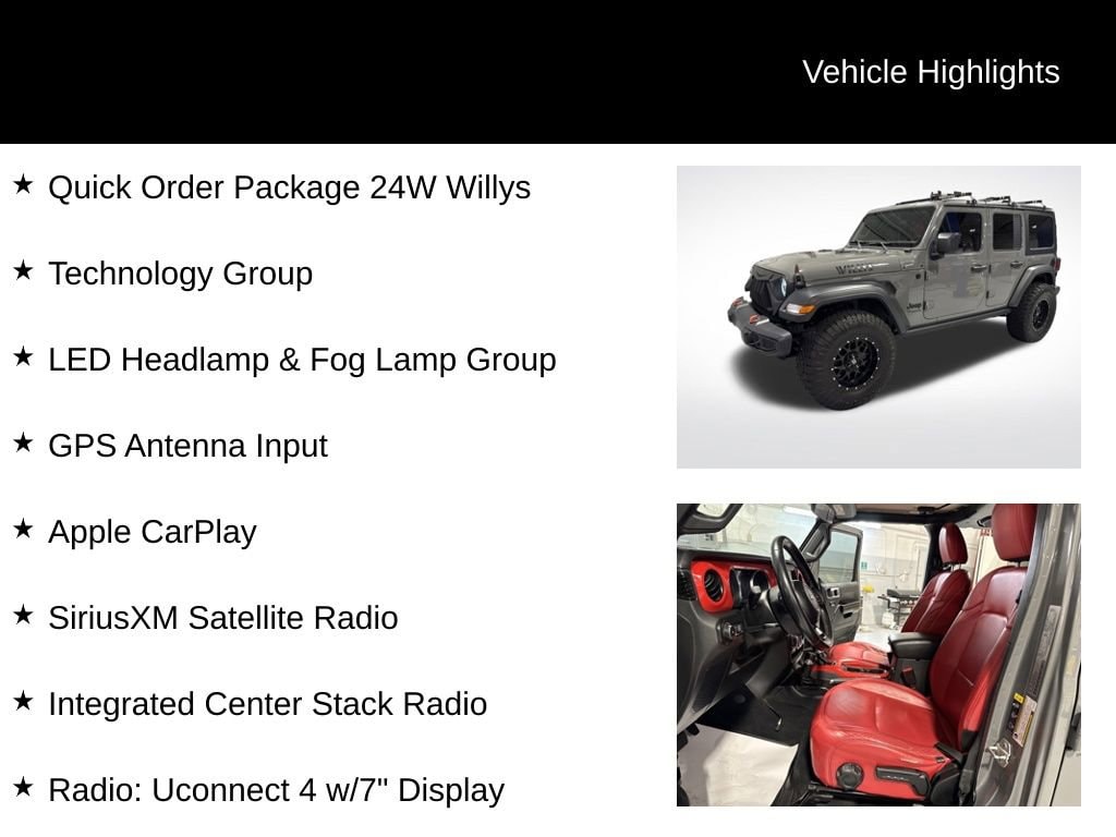 4-Wheel Drive Swing Gate Decal, 7.0 Touchscreen Display, Air Conditioning w/Auto Temperature Control, Air Filtering, Anti-Lock 4-Wheel Disc HD Brakes, Anti-Spin Differential Rear Axle, Apple CarPlay, Automatic Headlamps, Black Grille, Black Trail Rated Badge, Cluster 7.0 TFT Color Display, Deep Tint Sunscreen Windows, Front 1-Touch Down Power Windows, Front LED Fog Lamps, Google Android Auto, GPS Antenna Input, Integrated Center Stack Radio, Leather Wrapped Steering Wheel, LED Headlamp & Fog Lamp Group, LED Reflector Headlamps, Matte Black Jeep Badge, MOPAR All-Weather Floor Mats, Power Heated Mirrors, Quick Order Package 24W Willys, Radio: Uconnect 4 w/7 Display, Remote Keyless Entry, Security Alarm, SiriusXM Satellite Radio, Speed Sensitive Power Locks, Sun Visors w/Illuminated Vanity Mirrors, Technology Group, USB Host Flip, Wheels: 17 x 7.5 Moab Black Aluminum, Willys, Willys Hood Decal, Wrangler Decal.