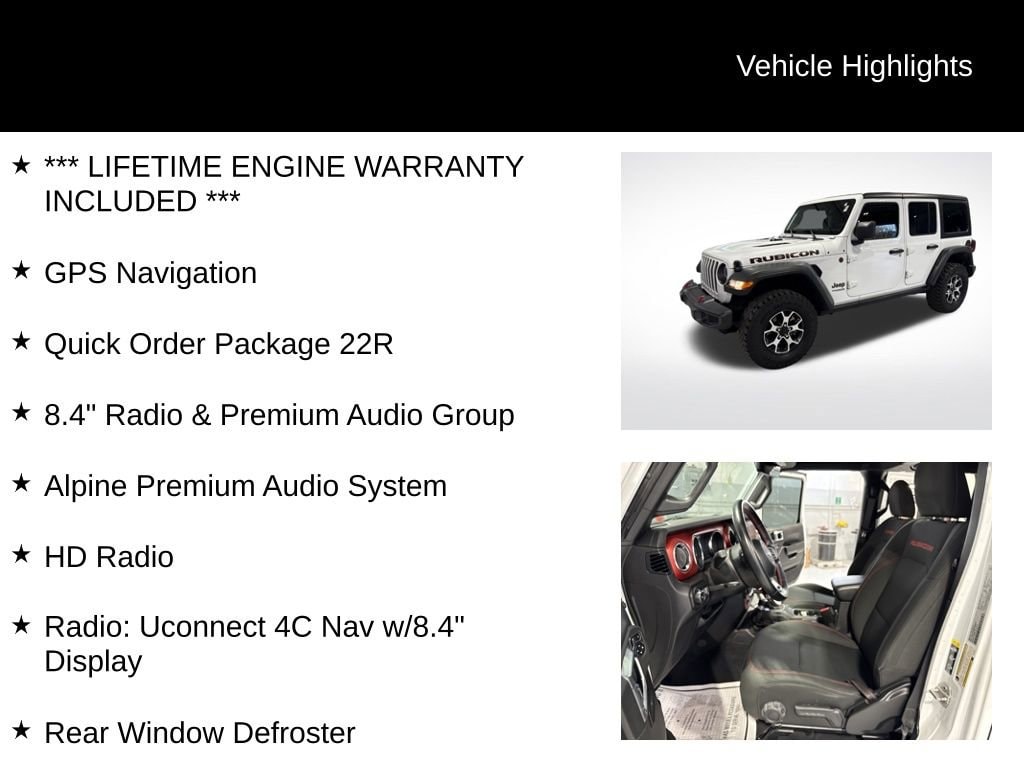 Priced below KBB Fair Purchase Price! Odometer is 9481 miles below market average!Bright White Clearcoat 2021 Jeep Wrangler Unlimited Rubicon 4D Sport Utility 4WD 2.0L I4 DOHC 8-Speed Automatic*** LIFETIME ENGINE WARRANTY INCLUDED ***, 1-Year SiriusXM Guardian Trial, 4.10 Rear Axle Ratio, 4G LTE Wi-Fi Hot Spot, 5-Year SiriusXM Traffic Service, 5-Year SiriusXM Travel Link Service, 8.4 Radio & Premium Audio Group, 8.4 Touchscreen Display, Alpine Premium Audio System, Apple CarPlay/Android Auto, Auto-Dimming Rear-View Mirror, Black 3-Piece Hard Top, Emergency/Assistance Call, For Details, Visit DriveUconnect.com, Freedom Panel Storage Bag, GPS Navigation, HD Radio, MOPAR Hardtop Headliner, No Soft Top, Non-Lock Fuel Cap w/o Discriminator, Off-Road Info Pages, ParkView Rear Back-Up Camera, Premium Cloth Low-Back Bucket Seats, Quick Order Package 22R, Radio: Uconnect 4C Nav w/8.4 Display, Rear Window Defroster, Rear Window Wiper/Washer, SiriusXM Traffic Plus, SiriusXM Travel Link, Wheels: 17 x 7.5 Machined w/Black Pockets.Please inquire for a personalized Video Walk-Around of this vehicle! Nationwide shipping available!Chevrolet of Wooster stands out as a top-tier Chevy dealership in the area, renowned for its extensive selection of new and used vehicles, a dedicated team of knowledgeable sales professionals, and a stellar service department that prioritizes customer satisfaction. They are widely recognized for their commitment to providing a transparent and friendly car buying experience, with a focus on understanding individual needs and tailoring options accordingly, while also offering competitive pricing and a strong reputation for quality maintenance and repairs. Whether you're looking for a new Chevy truck, a reliable used car, or expert service, Chevrolet of Wooster consistently delivers a positive experience for drivers in the Wooster community. Key points: Large vehicle selection: Wide variety of new and used Chevrolet models to choose from. Knowledgeable staff: Experienced sales team ready to answer questions and guide customers. Quality service department: Reliable maintenance and repair services for all Chevrolet vehicles. Customer-centric approach: Prioritizing customer satisfaction and building long-term relationships. Community involvement: Active presence and support for local initiatives in the Wooster area. We carry All Makes and Models** We have other vehicles with Apple CarPlay, Android Auto, Heads Up Display, Lane Departure System, Blind Spot Monitor, Heated Steering Wheel, Remote Start, Navigation, Rear Entertainment System, DVD Player, 3rd Row Seats, Backup Camera, Panoramic Sunroof, Bluetooth, Hands-Free, Adaptive Cruise Control, Leather Seats, Keyless Entry, Heated Seats, Tow Hitch, Tow Hooks, 4-Wheel Drive and All-wheel Drive, Active Park Assist, 360 degree Surround View Camera, Brake Assist, Power Liftgate, Third Row Seating, Keyless Entry. Although every reasonable effort has been made to ensure the accuracy of the information contained on this site, absolute accuracy cannot be guaranteed.