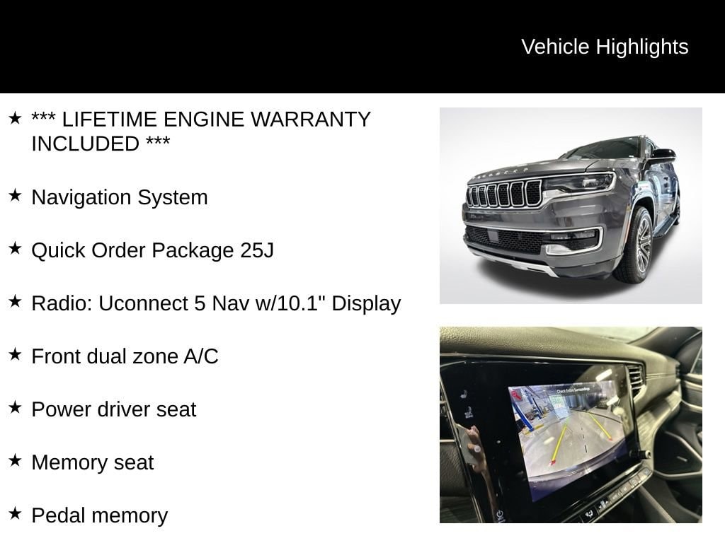 *** LIFETIME ENGINE WARRANTY INCLUDED ***, Apple CarPlay/Android Auto, Auto-leveling suspension, Exterior Parking Camera Rear, Front dual zone A/C, Genuine wood console insert, Genuine wood dashboard insert, Genuine wood door panel insert, Heated steering wheel, Memory seat, Navigation System, Pedal memory, Power driver seat, Power Liftgate, Quick Order Package 25J, Radio: Uconnect 5 Nav w/10.1 Display, Wheels: 20 x 9.0 Premium 2 Aluminum.
