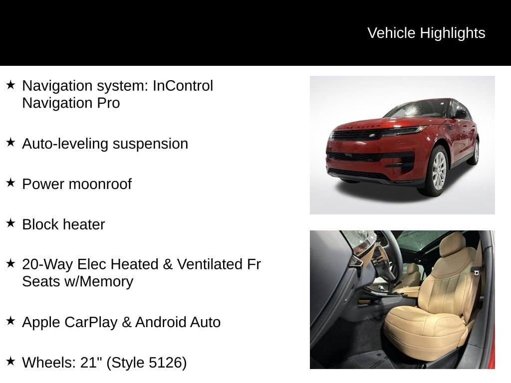 20-Way Elec Heated & Ventilated Fr Seats w/Memory, Apple CarPlay & Android Auto, Auto-leveling suspension, Block heater, Navigation system: InControl Navigation Pro, Power moonroof, Wheels: 21 (Style 5126), A/V remote, Adaptive suspension, Air Conditioning, AM/FM radio: SiriusXM, Auto High-beam Headlights, Auto tilt-away steering wheel, Auto-dimming Rear-View mirror, Automatic temperature control, Brake assist, Child-Seat-Sensing Airbag, Delay-off headlights, Driver's Seat Mounted Armrest, Dual front impact airbags, Dual front side impact airbags, Electronic Stability Control, Emergency communication system: InControl Protect, Exterior Parking Camera Rear, Four wheel independent suspension, Front anti-roll bar, Front Center Armrest w/Storage, Front dual zone A/C, Front fog lights, Fully automatic headlights, Garage door transmitter: HomeLink, Headlight cleaning, Heated door mirrors, Heated front seats, Heated rear seats, Heated steering wheel, Illuminated entry, Leather steering wheel, Low tire pressure warning, Memory seat, Occupant sensing airbag, Outside temperature display, Overhead airbag, Panic alarm, Passenger door bin, Passenger seat mounted armrest, Perforated Windsor Leather Seat Trim, Power door mirrors, Power Liftgate, Power passenger seat, Radio: Meridian Sound System, Rain sensing wipers, Rear anti-roll bar, Rear fog lights, Rear window defroster, Rear window wiper, Security system, Speed control, Speed-sensing steering, Speed-Sensitive Wipers, Steering wheel mounted audio controls, Traction control, Trip computer, Turn signal indicator mirrors, Variably intermittent wipers, 20-Way Elec Heated & Ventilated Fr Seats w/Memory, Apple CarPlay & Android Auto, Auto-leveling suspension, Block heater, Navigation system: InControl Navigation Pro, Power moonroof, Wheels: 21 (Style 5126).