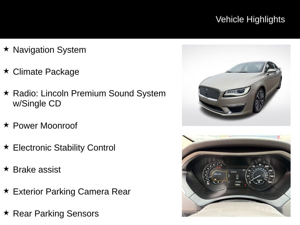 Auto High Beams, Brake assist, Climate Package, Electronic Stability Control, Exterior Parking Camera Rear, Heated front seats, Heated Rear-Seats, Heated Steering Wheel, Navigation System, Power Moonroof, Radio: Lincoln Premium Sound System w/Single CD, Rain Sensing Wipers, Rear Parking Sensors, SYNC 3, Wheels: 19 Polished Machined-Aluminum, Windshield Wiper De-Icer.