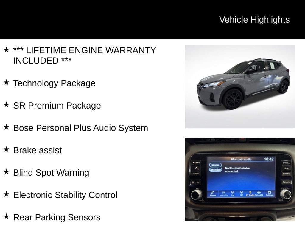 *** LIFETIME ENGINE WARRANTY INCLUDED ***, Apple CarPlay/Android Auto, Auto High-beam Headlights, Blind Spot Warning, Bose Personal Plus Audio System, Brake assist, Carpeted Floor Mats w/Cargo Mat, Electronic Stability Control, Exterior Parking Camera Rear, Front Bucket Seats, Heated Front Seats, Heated Steering Wheel, NissanConnect Services, Prima-Tex Appointed Seat Trim, Rear Parking Sensors, Rear window wiper, Security System, Speed control, Sport steering wheel, SR Premium Package, Technology Package, Tonneau Cover, Variably intermittent wipers, Wheels: 17 Black Alloy.