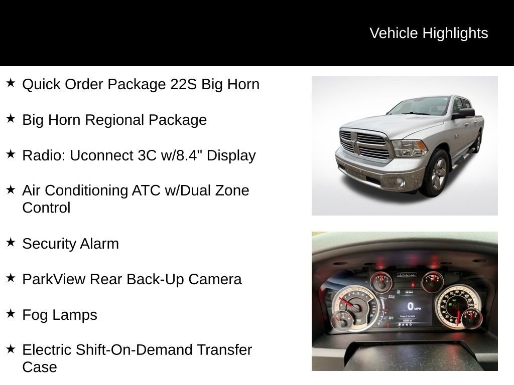 Air Conditioning ATC w/Dual Zone Control, Auto-Dimming Exterior Mirrors, Auto-Dimming Rear-View Mirror, Big Horn Badge, Big Horn Regional Package, Bright/Bright Billets Grille, Class IV Receiver Hitch, Electric Shift-On-Demand Transfer Case, Electroluminescent Instrument Cluster, Exterior Mirrors Courtesy Lamps, Exterior Mirrors w/Supplemental Signals, Fog Lamps, Glove Box Lamp, Leather Wrapped Steering Wheel, LED Bed Lighting, Overhead Console w/Garage Door Opener, ParkSense Front/Rear Park Assist System, ParkView Rear Back-Up Camera, Power Heated Fold-Away Mirrors, Power-Folding Mirrors, Premium Cloth 40/20/40 Bench Seat, Quick Order Package 22S Big Horn, Radio: Uconnect 3C w/8.4 Display, Rear Dome w/On/Off Switch Lamp, Remote Start System, Security Alarm, Steering Wheel Mounted Audio Controls, Sun Visors w/Illuminated Vanity Mirrors, Underhood Lamp, Wheels: 20 x 8 Aluminum Chrome Clad.