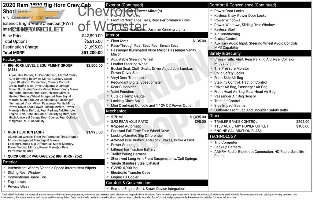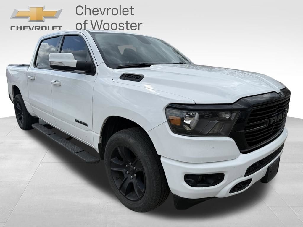 115V Auxiliary Power Outlet, 115V Auxiliary Rear Power Outlet, 2 USB Full Function/Charge Only Media Hub, 2nd Row In Floor Storage Bins, 3 Rear Seat Head Restraints, 4 Way Front Headrests, 4-Wheel Disc Brakes, 400W Inverter, 48V Belt Starter Generator, 6 Speakers, ABS brakes, Air Conditioning, Air Conditioning ATC w/Dual Zone Control, Alloy wheels, AM/FM radio, Anti-Spin Differential Rear Axle, Auto-Dimming Exterior Driver Mirror, Auto-Dimming Rear-View Mirror, Big Horn Badge, Big Horn IP Badge, Big Horn Level 2 Equipment Group, Black Exterior Truck Badging, Black Headlamp Bezels, Black Interior Accents, Black Premium Power Mirrors, Body Color Door Handles, Body Color Exterior Mirrors, Body Color Front Bumper, Body Color Premium Power Mirrors, Body Color Rear Bumper w/Step Pads, Brake assist, Bucket Seats, Bumpers: chrome, Class IV Receiver Hitch, Cloth Bench Seat, Compass, Dampened Tailgate, Delay-off headlights, Deluxe Cloth Bucket Seats, Driver door bin, Dual Exhaust w/Black Tips, Dual front impact airbags, Dual front side impact airbags, Electronic Stability Control, Engine Calibration Flash (DISC), Exterior Mirrors Courtesy Lamps, Exterior Mirrors w/Memory, Foam Bottle Insert (Door Trim Panel), Front & Rear Rubber Floor Mats, Front anti-roll bar, Front Center Armrest w/Storage, Front fog lights, Front reading lights, Front Seat Back Map Pockets, Front wheel independent suspension, Full Length Floor Console, Fully automatic headlights, Glove Box Lamp, GPS Antenna Input, Grille Surround 1 Black Texture 2 Black, Heated door mirrors, Heated Front Seats, Heated Steering Wheel, Illuminated entry, Leather steering wheel, Low tire pressure warning, Manual Adjust 4-Way Front Passenger Seat, Night Edition, Occupant sensing airbag, Outside temperature display, Overhead airbag, Overhead console, Panic alarm, ParkSense Front/Rear Park Assist w/Stop, ParkView Rear Back-Up Camera, Passenger door bin, Passenger vanity mirror, Power 4-Way Driver Lumbar Adjust, Power 8-Way Driver Seat, Power Adjustable Pedals, Power door mirrors, Power steering, Power windows, Power-Folding Mirrors, Quick Order Package 25Z Big Horn, Radio data system, Radio: Uconnect 3 w/5 Display, Radio: Uconnect 4 w/8.4 Display, Rear 60/40 Folding Seat, Rear anti-roll bar, Rear Dome w/On/Off Switch Lamp, Rear Power Sliding Window, Rear seat center armrest, Rear step bumper, Rear Window Defroster, Remote keyless entry, Remote Start System, Security Alarm, SiriusXM Satellite Radio, Speed control, Split folding rear seat, Steering wheel mounted audio controls, Sun Visors w/Illuminated Vanity Mirrors, Tachometer, Telescoping steering wheel, Tilt steering wheel, Traction control, Trailer Brake Control, Trip computer, Universal Garage Door Opener, Variably intermittent wipers, Voltmeter, Wheels: 18 x 8 Cast-Aluminum Painted, Wheels: 20 x 9.0 Premium Paint/Polished. 2020 Ram 1500 Big Horn/Lone StarWe offer video and live video chat. Please reach out to our sales department for more information (330) 439-4949. In an effort to save you time and money, we utilize 3rd party software to help analyze market pricing to be as competitive as possible. Hurry, this pricing philosophy leads to our vehicles selling very quickly. Nationwide shipping available!Recent Arrival! Odometer is 4272 miles below market average!Thank you for taking the time to look at this fantastic-looking 2020 Ram 1500. Here at Chevrolet of Wooster we use live market pricing. Our price is pulled live today using Cox vAuto Market Scan. Whether you are looking for a Great Deal, a Great Price, or a Great Value, Chevrolet of Wooster has you covered. Also get a complimentary AutoCheck today. Join us for the best experience you will ever have. If we do not have what you are looking for, just let us know and we will find it. We have access to any make/model and offer Certified Pre-Owned vehicles too. We can also locate vehicles with just about any option to include Sunroof, Moonroof, Navig