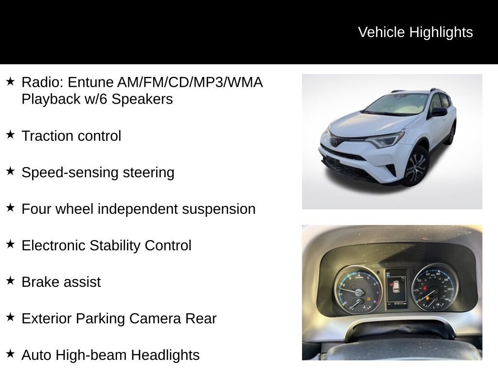 Recent Arrival!White 2018 Toyota RAV4 LE 4D Sport Utility AWD 2.5L 4-Cylinder DOHC Dual VVT-i 6-Speed AutomaticAWD, Cloth, Auto High-beam Headlights, Brake assist, Electronic Stability Control, Exterior Parking Camera Rear, Four wheel independent suspension, Front Bucket Seats, Panic alarm, Radio: Entune AM/FM/CD/MP3/WMA Playback w/6 Speakers, Speed control, Speed-sensing steering, Traction control, Wheels: 17 x 6.5J, 4-Wheel Disc Brakes, 4.071 Axle Ratio, 6 Speakers, ABS brakes, Air Conditioning, AM/FM radio, Bumpers: body-color, CD player, Driver door bin, Driver vanity mirror, Dual front impact airbags, Dual front side impact airbags, Fabric Seat Trim, Front anti-roll bar, Front Center Armrest, Front reading lights, Fully automatic headlights, Illuminated entry, Knee airbag, Low tire pressure warning, Occupant sensing airbag, Outside temperature display, Overhead airbag, Overhead console, Passenger door bin, Passenger vanity mirror, Power door mirrors, Power steering, Power windows, Radio data system, Rear anti-roll bar, Rear seat center armrest, Rear window defroster, Rear window wiper, Remote keyless entry, Split folding rear seat, Spoiler, Steering wheel mounted audio controls, Tachometer, Telescoping steering wheel, Tilt steering wheel, Trip computer, AWD, Cloth, Auto High-beam Headlights, Brake assist, Electronic Stability Control, Exterior Parking Camera Rear, Four wheel independent suspension, Front Bucket Seats, Panic alarm, Radio: Entune AM/FM/CD/MP3/WMA Playback w/6 Speakers, Speed control, Speed-sensing steering, Traction control, Wheels: 17 x 6.5J.Please inquire for a personalized Video Walk-Around of this vehicle! Nationwide shipping available!Chevrolet of Wooster stands out as a top-tier Chevy dealership in the area, renowned for its extensive selection of new and used vehicles, a dedicated team of knowledgeable sales professionals, and a stellar service department that prioritizes customer satisfaction. They are widely recognized for their commitment to providing a transparent and friendly car buying experience, with a focus on understanding individual needs and tailoring options accordingly, while also offering competitive pricing and a strong reputation for quality maintenance and repairs. Whether you're looking for a new Chevy truck, a reliable used car, or expert service, Chevrolet of Wooster consistently delivers a positive experience for drivers in the Wooster community. Key points: Large vehicle selection: Wide variety of new and used Chevrolet models to choose from. Knowledgeable staff: Experienced sales team ready to answer questions and guide customers. Quality service department: Reliable maintenance and repair services for all Chevrolet vehicles. Customer-centric approach: Prioritizing customer satisfaction and building long-term relationships. Community involvement: Active presence and support for local initiatives in the Wooster area. We carry All Makes and Models** We have other vehicles with Apple CarPlay, Android Auto, Heads Up Display, Lane Departure System, Blind Spot Monitor, Heated Steering Wheel, Remote Start, Navigation, Rear Entertainment System, DVD Player, 3rd Row Seats, Backup Camera, Panoramic Sunroof, Bluetooth, Hands-Free, Adaptive Cruise Control, Leather Seats, Keyless Entry, Heated Seats, Tow Hitch, Tow Hooks, 4-Wheel Drive and All-wheel Drive, Active Park Assist, 360 degree Surround View Camera, Brake Assist, Power Liftgate, Third Row Seating, Keyless Entry. Although every reasonable effort has been made to ensure the accuracy of the information contained on this site, absolute accuracy cannot be guaranteed.
