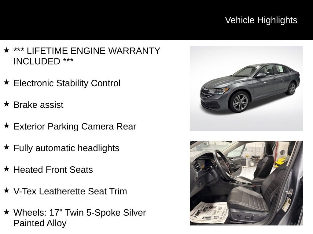 Step inside the Jetta and you'll be greeted by a wealth of premium features that elevate the driving experience. Enjoy the comfort of heated front seats, the convenience of a rearview camera, and the connectivity of the MIB3 Composition Color infotainment system with a 6.5 touchscreen. Safety is also a top priority, with features like Brake Assist, Electronic Stability Control, and Active Blind Spot Monitor keeping you and your loved ones secure on the road.